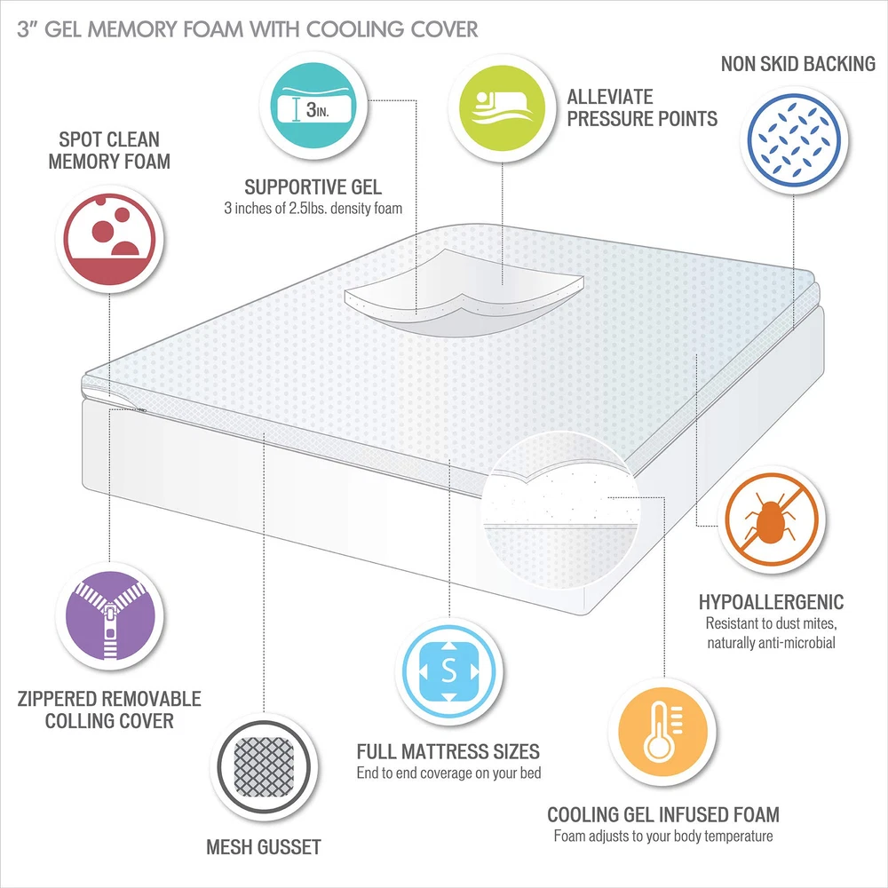 The 3" Gel Memory Foam Topper features a unique hole punch design to provide maximum airflow, that along with the cooling gel-infused memory foam, providing the ultimate in sleeping comfort. Along with keeping you cooler, this topper helps to alleviate pressure points while the 2.5 lb. density temperature control foam adjusts to your body temperature. Our topper also comes with a zippered removable cover that features a unique fabrication that’s always "crisp and cool to the touch". In addition, it has a mesh gusset to allow for even more airflow while you sleep. A non-skid backing locks the topper in place on your mattress. Another feature we know you’ll appreciate is that our slightly oversized topper comes in full mattress sizes to give your bed end-to-end coverage. Our packaging technology allows the mattress topper to be efficiently compressed into one box that’s easily shipped to your door. Simply unbox, unroll, and this mattress topper does the rest, expanding to its original shape within 72 hours. The memory foam elastic material adjusts to your body's contours, make a world difference in the quality of sleep Cover features a unique fabrication that’s always “cool to the touch” Cover with zipper can be taken off for machine wash, and easy care The anti-slip reverse side of the cover keeps the topper in place 2.5 lb. density temperature sensitive memory foam that adjusts to your body temperature to help alleviate pressure points and relax muscles