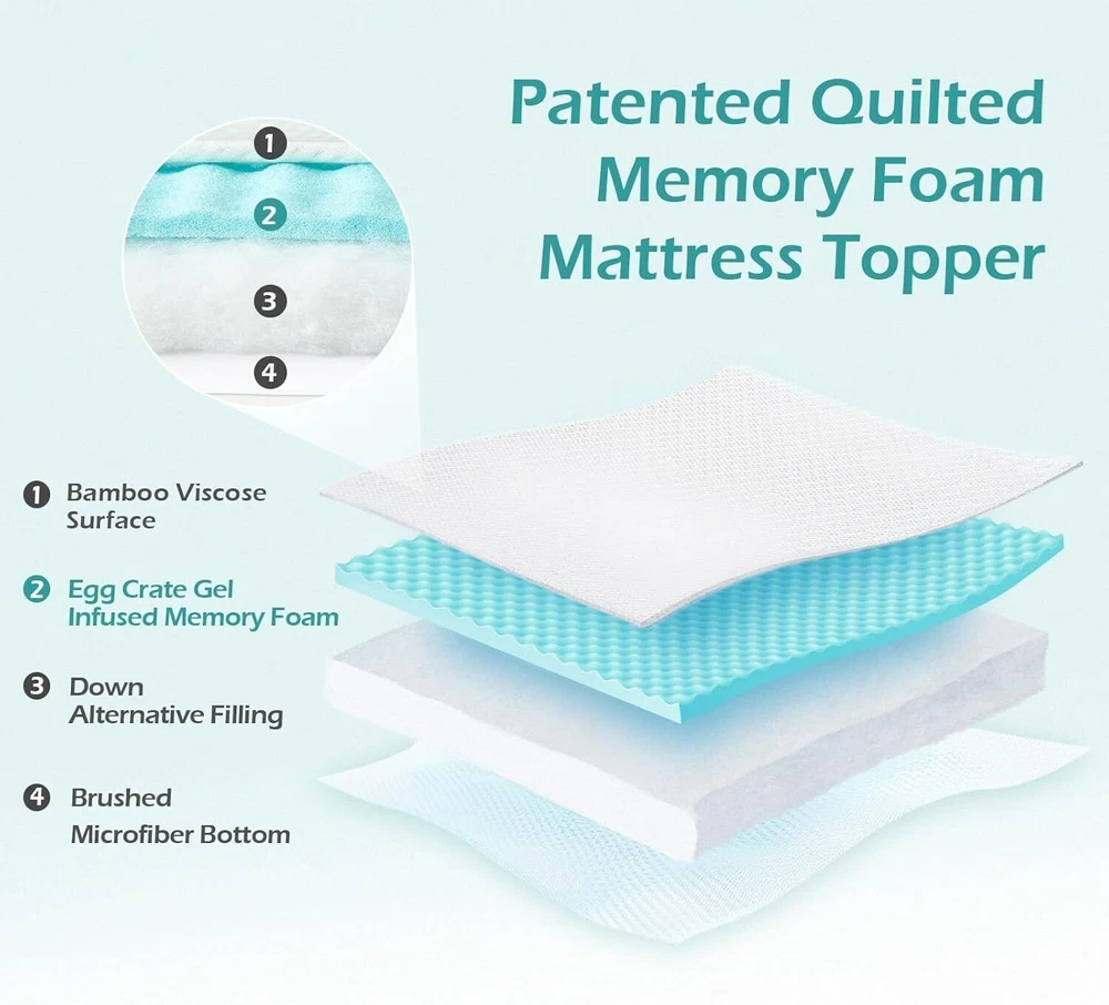 You may also like 3 in Egg Crate Memory Foam Mattress Topper with Soothing Lavender Infusion Twin 45.69 USD 48.09 USD Free shipping 5% off Memory Foam Mattress Topper Twin Pad Cover Deep Pocket Breathable for Single Bed 50.63 USD 53.3 USD Free shipping 5% off Memory Foam Mattress Topper Gel Pad with Deep Pocket Breathable Air Twin Cover 50.05 USD 52.68 USD Free shipping 5% off Queen Mattress Topper Thick Cooling Breathable Pillow Top for Back Pain Relief 50.63 USD 53.29 USD Free shipping 5% off Mattress Topper 2 Inch Gel Infused Memory Foam Plush Feel Cooling Queen Size 74.09 USD 77.99 USD Free shipping 5% off 2 Inch Twin Mattress Topper Gel Infused Swirl Memory Foam Bed Topper Cooling 71.62 USD 75.39 USD Free shipping 5% off Mattress Topper Soft Cooling Breathable Pillow Top Mattress Pad Deep Pocket Twin 54.33 USD 57.19 USD Free shipping 5% off Mattress Topper Cooling Breathable Pillow Top Mattress Pad Deep Pocket King New 66.68 USD 70.19 USD Free shipping 5% off Memory Foam Twin XL Mattress Topper for College Dorm Room Essentials, Twin XL Mattress Pad Cover with Deep Pocket, Pillow Top Mattress Topper Twin XL with Gel Foam, 39x80 Inches, White Color White Size Twin XL 39" x 80" Fabric Type 80%polyester, 20%viscose Special Feature College Dorm Room Essentials, Eco-Friendly, Washable, Moisture-Wicking About this item SUPPORTIVE MEMORY FOAM LAYER: memory foam mattress topper boasts a unique structure that combines a gel-infused memory foam layer and down alternative fillings. This design ensures weight distribution is even and pressure is relieved from different points of the body. It's an excellent addition for a firm mattress. PREMIUM SURFACE: This mattress topper features a 3D premium surface that wicks away night sweat. Combined with the cooling gel infused in the memory foam, it provides a breathable and comfortable sleep environment. DEEP POCKET DESIGN: The deep pocket mattress pad can stretch up to 21 inches deep, ensuring it fits snugly on any mattress and stays in place throughout the night. EASY TO INSTALL & MAINTAIN: The fitted sheet design of this mattress cover makes it incredibly easy to install on your mattress. It is also machine washable, which means it can be effortlessly cleaned and maintained, providing you with an effortless and hassle-free experience. CARE INSTRUCTIONS: mattress topper comes vacuum-packed and may appear thinner upon unpacking. Please allow it two days to regain its shape and thickness. Spot cleaning is recommended. It's machine washable with cold water on a gentle cycle. Tumble dry low. Do Not Iron, Do Not Dry Clean. You may also like Whisper Power Filter 40 Gallons Quiet 3-Stage Aquarium Filtration Absorbs Odors 45.4 USD 47.79 USD Free shipping 5% off 12.5" Recreational Baseball & Softball Glove All-Leather Shell Right Hand Throw 51.51 USD 54.22 USD Free shipping 5% off End Table with Charging Station Flip Top Side Table with USB Ports and Outlets 56.8 USD 59.79 USD Free shipping 5% off Small Portable Space Heater for Indoor use with Realistic 3D Flame Fireplace 55.57 USD 58.49 USD Free shipping 5% off Tactical Gun Rifle Clamp Shooting Tripod Rest Universal 2 in 1 Clamp for Hunting 53.1 USD 55.89 USD Free shipping 5% off 3 in Egg Crate Memory Foam Mattress Topper with Soothing Lavender Infusion Twin 45.69 USD 48.09 USD Free shipping 5% off Electric 6-Cup Coffee Percolator W/ Keep Warm Clear Brew Progress Knob Stainless 49.39 USD 51.99 USD Free shipping 5% off Media Storage Spinner Rack Movie CD Video Rack Game Organizer Tower Stand Home 66.85 USD 70.37 USD Free shipping 5% off 5-Tier Ladder Wooden Bookshelf Living Room Organization for Display Books Plants 54.11 USD 56.96 USD Free shipping 5% off 1500W PTC Electric Space Heater with 90°Adjustable Angle Portable Home Office 47.1 USD 49.58 USD Free shipping 5% off Power Tool Organizer Wall Mount with Charging Station 4 Layer Heavy Duty Metal 81.5 USD 85.79 USD Free shipping 5% off Foldable Rollator Walker with Seat 2-wheel Padded Seat and Backrest Lightweight 92.62 USD 97.5 USD Free shipping 5% off
