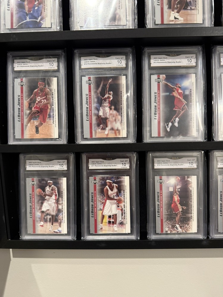 The product is a full set of 20 rookie trading cards featuring basketball legend LeBron James from the 2003 Upper Deck collection ALL GEM MINT GMA 10s! These cards showcase the beginning of LeBron's remarkable career in the National Basketball Association (NBA), making them highly sought after by collectors and fans alike. As part of the Upper Deck manufacturer's set, these cards are a valuable piece of sports memorabilia that captures a pivotal moment in one of the greatest player's early years in the league.