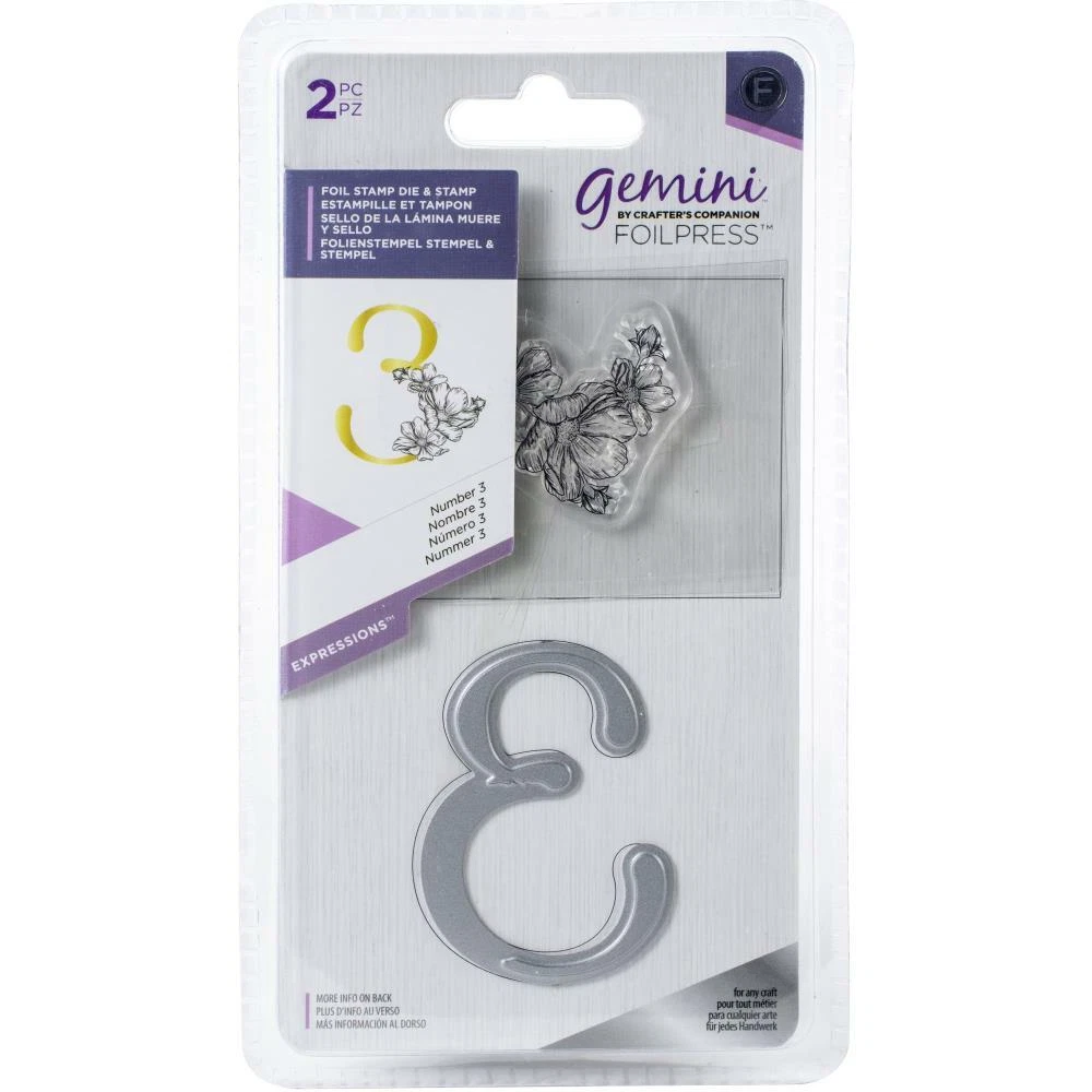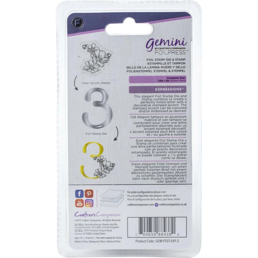 Gemini FOILPRESS Expressions Large Stamp and Die Set - Number 3 Make your papercraft projects that little bit more personal with the Gemini Foilpress Stamp Die & Stamp range. This range features every letter and number, plus number suffixes, to help you create beautiful monograms, milestone crafts and more! In this set, you receive a '3' Foil Stamp Die, which is designed to pair up with your Gemini Foilpress. All you need to do is: Pop the die on to the heated platform and allow it to warm up Trim your foil to size and when the green light shows, place the foil coloured side down on top of the die Place your chosen material face down on top of the foil and place the top plate on top Using the Silicone Finger Grips, remove the Foiling Platform with the top plate from the base and roll it through the Gemini die-cutting machine. You will now have a foiled and debossed number! This Foil Stamp Die also comes with a separate floral stamp that aligns perfectly with the spaces in the foil number. This allows you to add a delicate detail to your monograms, names, phrases or sentiments, making it perfect for wedding stationery, notebook covers and more. Add colour to your floral detail or try your hand at heat embossing to make the design stand out even further. You can also use the stamp alongside our Stamping Platforms to make sure that the floral design matches up with the number as perfectly as possible. This is the perfect tool to add to your collection whether you're an avid Foilpress fan or a total newbie. Completed image measure 1.8" x 2" (4.5cm x 5cm)