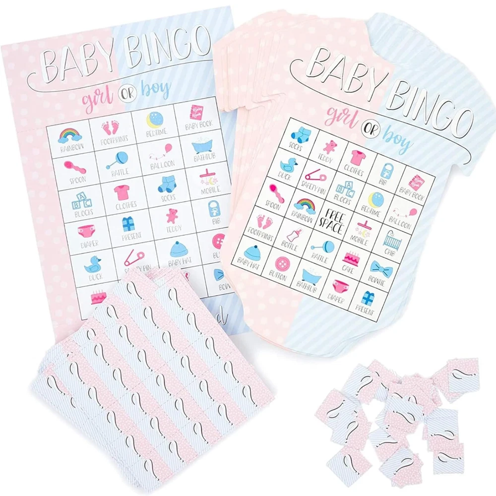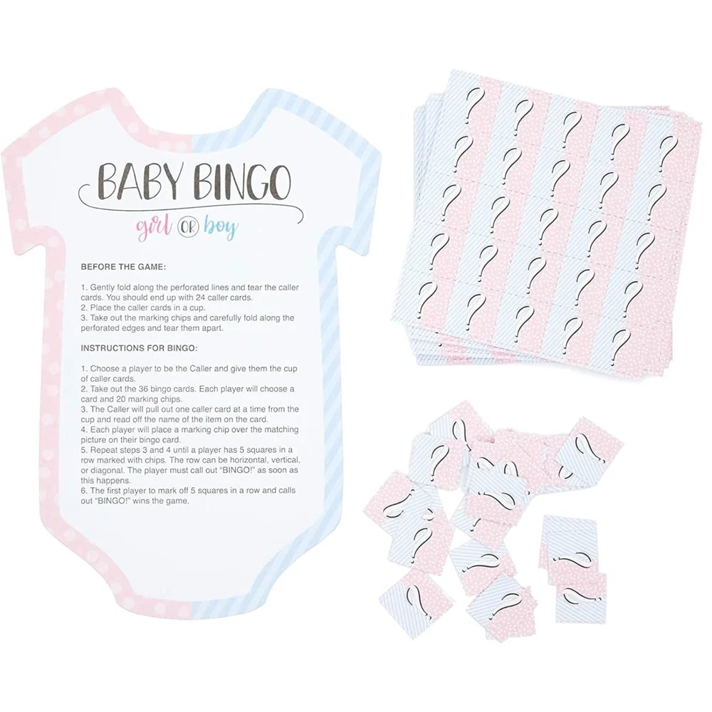 Gender Reveal Bingo Game Set, Party Supplies (38 Pieces) FUN FOR EVERYONE: Gender reveal bingo will be fun for adults of all ages. This game allows 36 players to play at once, so everyone can join in on the fun. PERFECT FOR: This bingo set is great for baby showers and gender reveal parties to get your guests in a festive mood MULTIPLE DESIGNS: Featuring 36 unique and colorful designs with corresponding baby clothes shaped cards caller chips HIGH QUALITY: Made from cardstock with single-side printing WHAT’S INCLUDED: Includes 36 bingo cards; 36 designs, 1 calling card, and game chips Product Description Gender reveal bingo will be fun for adults of all ages. This game allows 36 players to play at once, so everyone can join in on the fun. This bingo set is great for baby showers and gender reveal parties to get your guests in a festive mood.