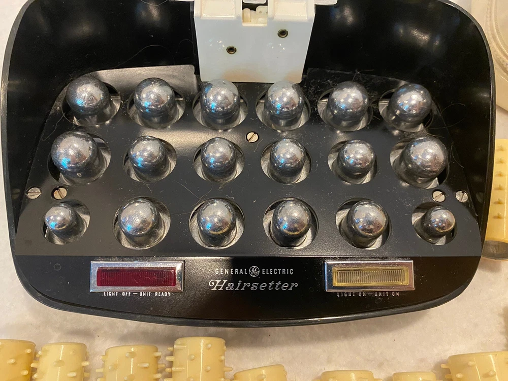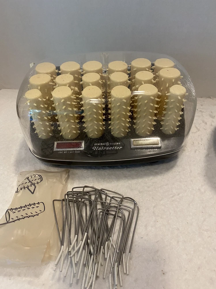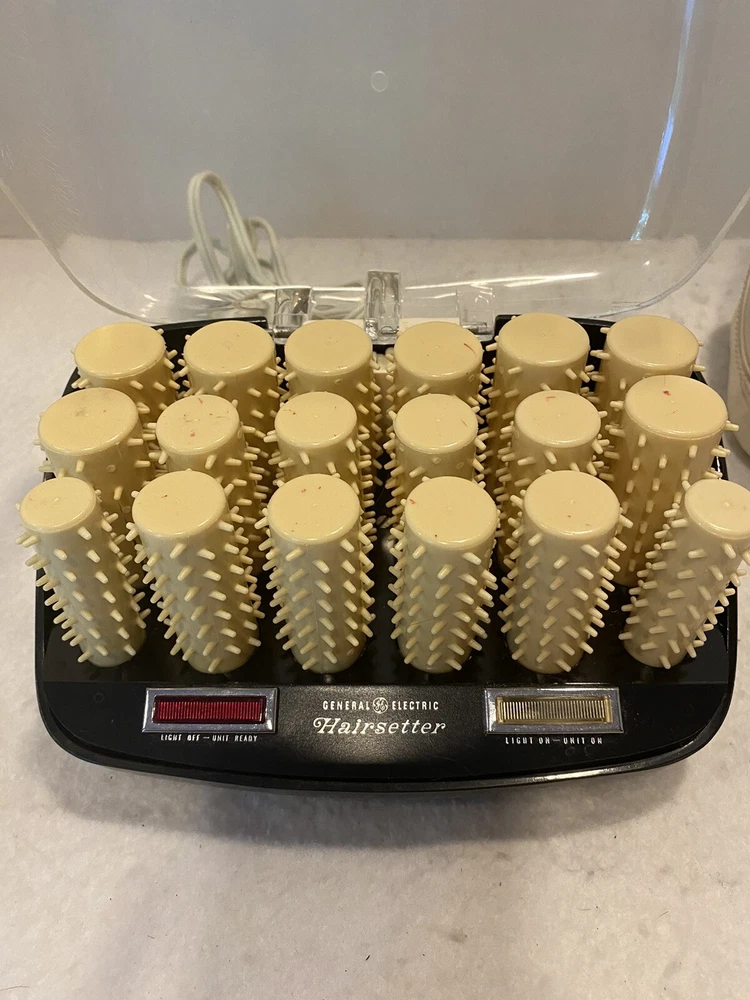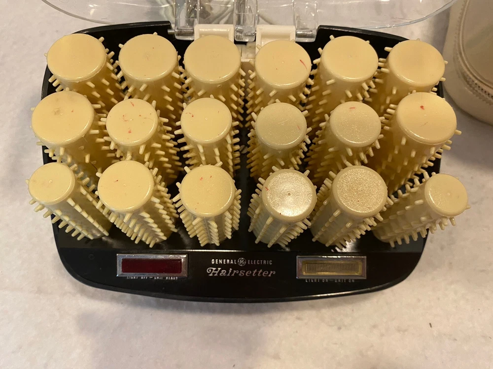 Has been tested and works great! A few rollers have cracked casings, see pics. Includes 20 pins to hold rollers. Note - so work, the lid must remain OPEN! Closing the lid will turn it off. General Electric Hair Curler Hairsetter Hot Rollers Model No F1HCD1 Travel Bag.