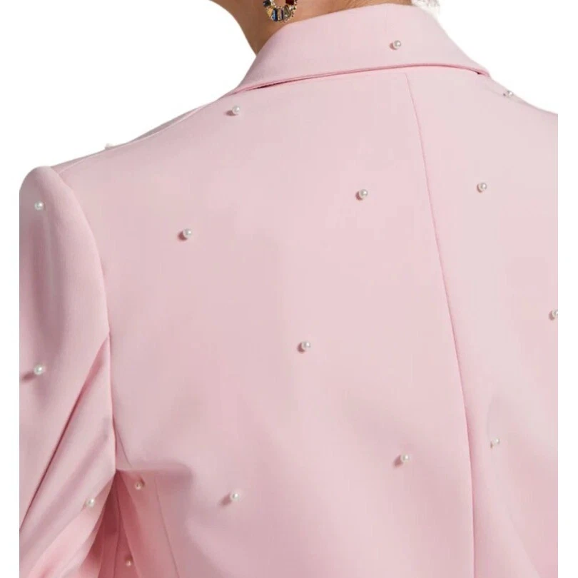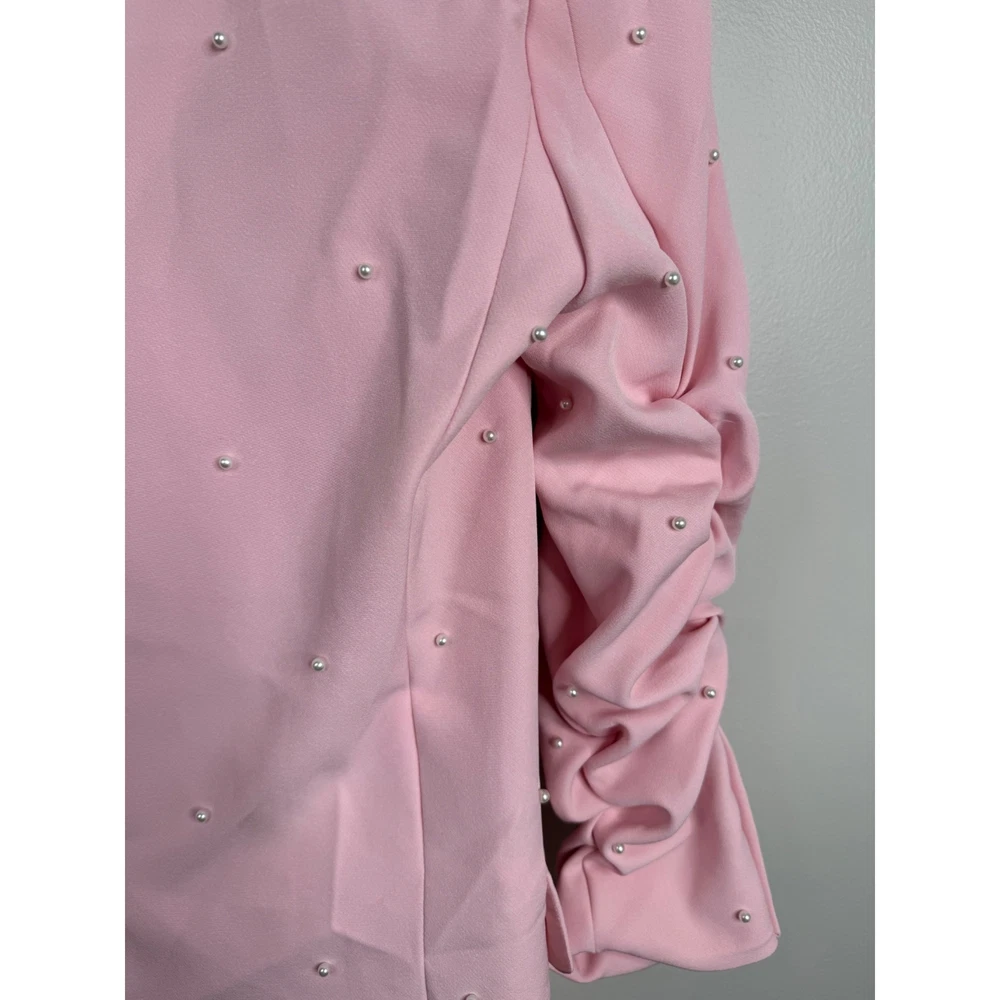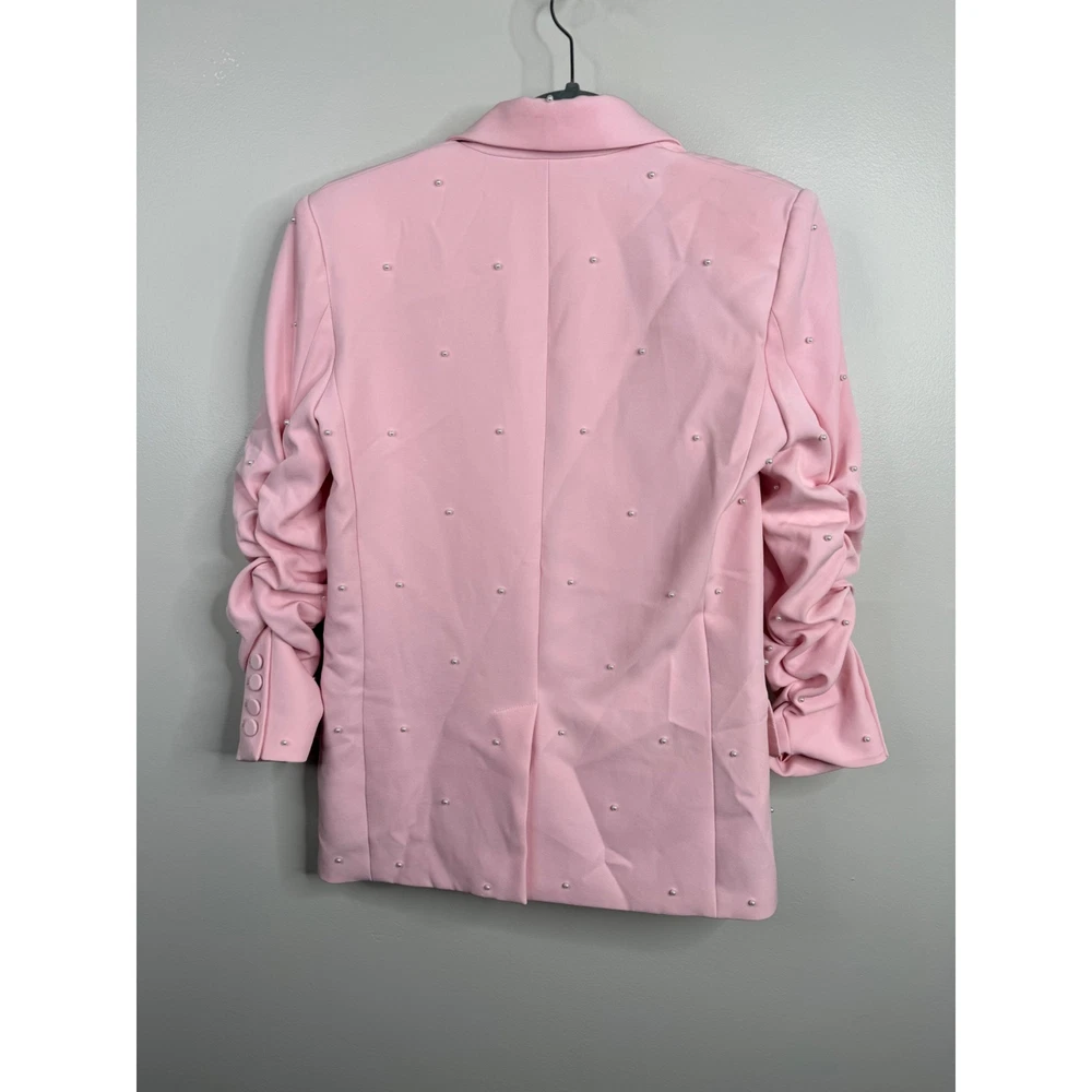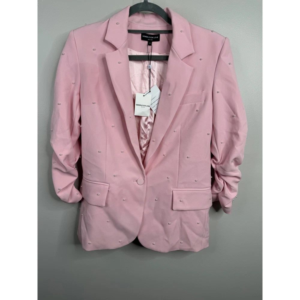 Generation Love Nadia Pearl Blazer Jacket Ruched Sleeves Pastel Pink Size XS New w/ tags Retail $395 The "Nadia Pearl Blazer" from Generation Love features a relaxed silhouette with pearl detailing and ruched sleeves. Self: 95% Polyester, 5% Spandex Fully Lined with 95% Polyester, 5% Spandex 3/4 sleeves Pearl embellished Collared Button front closure Flap front pockets Lined Length: 25" Armpit to armpit: 18.5" Features: • Blazer Size: Womens XS Condition: New With Tags