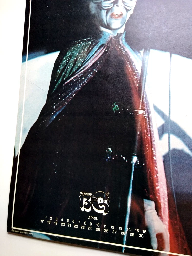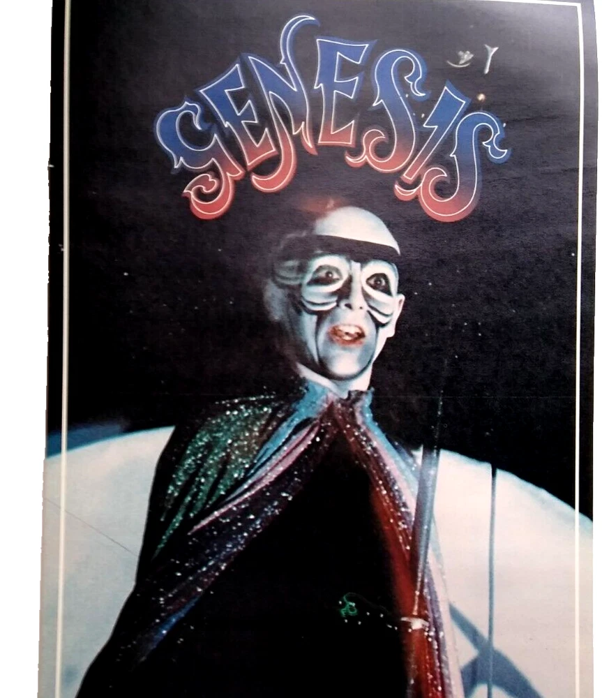 Striking image of vocalist Peter Gabriel in costume at the height of the glam art rock movement. Vintage 22" x 12.25" licensed wall poster. These were the first glossy licensed paper posters ever produced featuring rock stars. Dream Merchants issued a different one each month for a year. Now, they are nearly impossible to find. Issued in November, 1975. Super nice UNUSED condition with light age wear. More music related memorabilia for sale in our store. Bundle and save by using cart and making single payment.