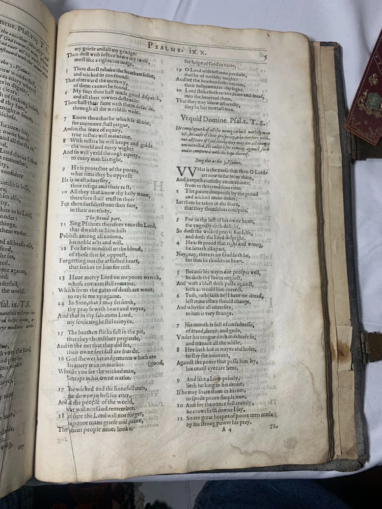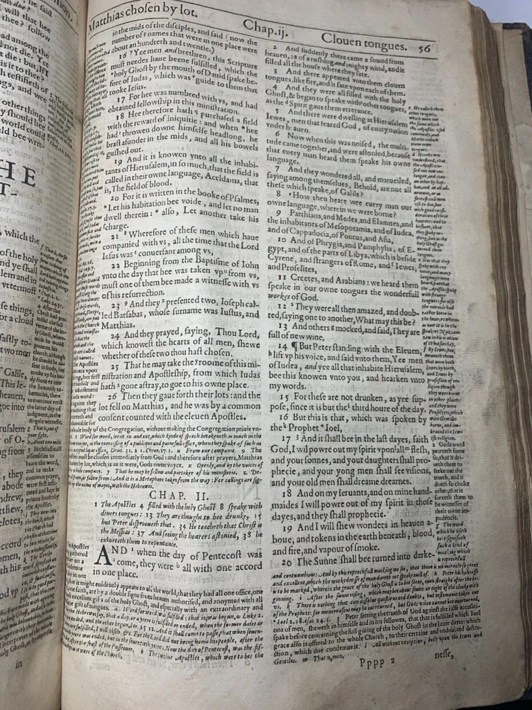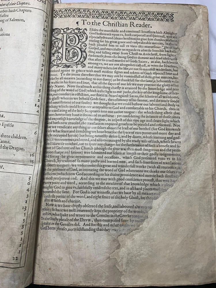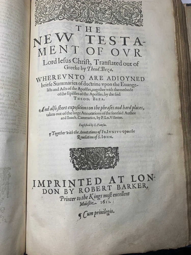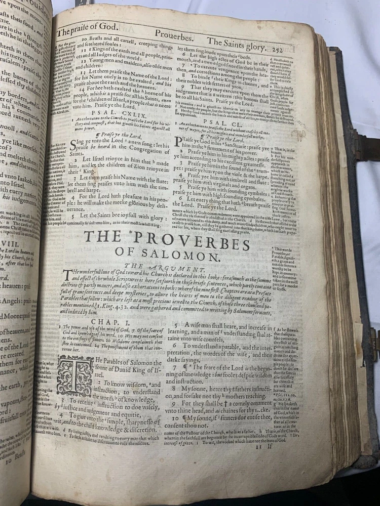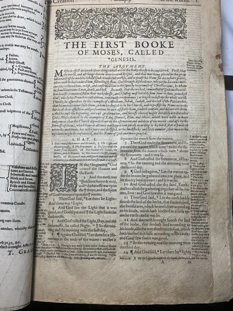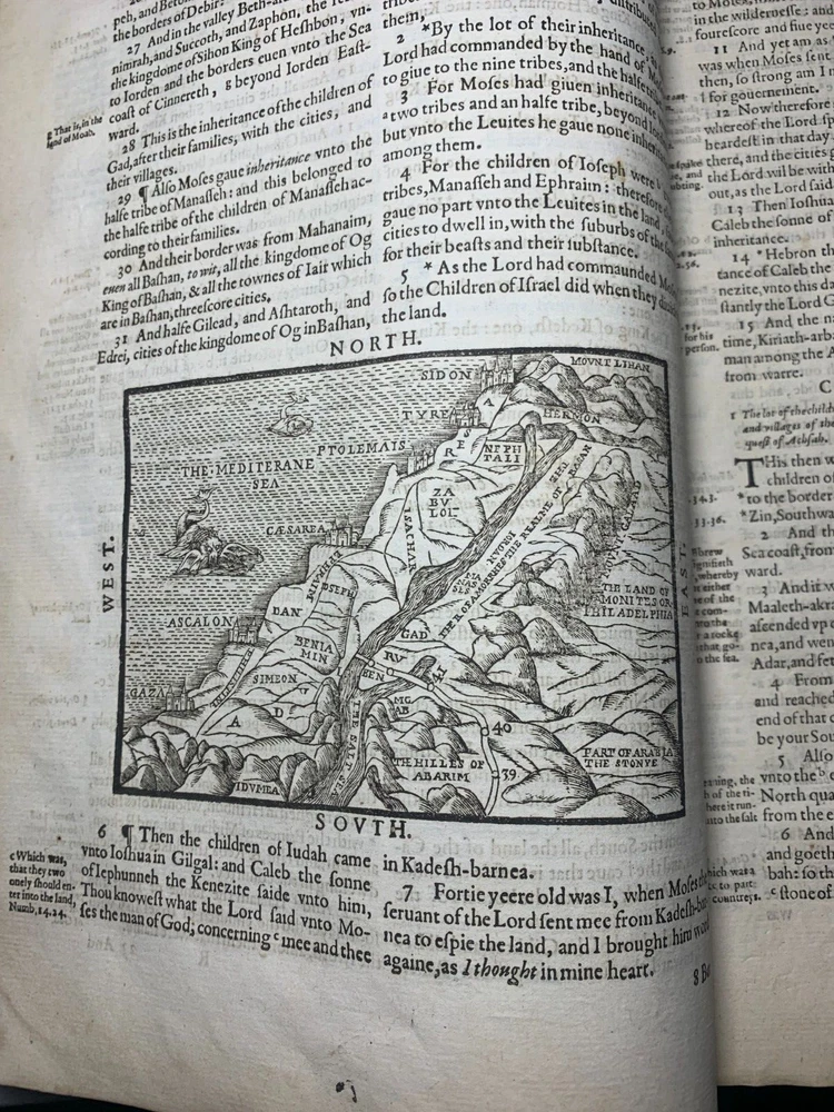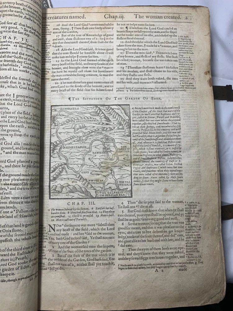 Geneva "Breeches" Folio Bible 1609, With Original Brass Clasps: A Geneva or 'Breeches' Bible, early 17th century, folio, full leather, gilt embossed decoration to boards, brass clasps (one at fault). On the inside of the front cover there is various inscriptions from previous owners. There are many beautiful illustrations of maps from the supposed location of the Garden of Eden and other references occurring during the Old Testament Why This Is Fascinating / Why You Should Buy This This 1609 Geneva “Breeches” Folio Bible is a rare and remarkable survivor from the early 17th century—a true centrepiece for any collector of antiquarian books, religious texts, or historical artefacts. Known for its iconic translation of Genesis 3:7 (“they sewed figge tree leaves together, and made themselves breeches”), the Geneva Bible was the preferred Bible of the Pilgrims and widely used during the Reformation era. What sets this particular example apart? Large folio format : Once reserved for churches or wealthy households. Original brass clasps still present (one partially at fault)—an increasingly rare survival. Full leather binding with gilt embossed decoration , lending it both historical authenticity and visual appeal. Inscriptions from previous owners inside the front cover offer a tangible connection to its centuries-long journey . Beautifully illustrated with woodcut maps and imagery , including a depiction of the Garden of Eden , bringing the text vividly to life. Whether you're a serious Bible collector, a lover of early printed books, or seeking a profound display piece rich with religious and artistic history, this folio Geneva Bible is a compelling acquisition. Its size, detail, and well-preserved features make it not just a book—but a legacy. Condition Report – Geneva Folio Bible Old Testament: Title page is missing . The “Garden of Eden” engraving , originally from the start of Genesis, has been moved and repurposed as a title page . “To the Christian Reader” : Present but repaired . “Of the Incomparable Treasure of the Holy Scriptures [...]” : Present but repaired . Leaves are foliated 1–362 , with several mis numbered , but the text remains continuous . New Testament: Contains original title page : “Imprinted at London by Robert Barker, Printer to the King’s most excellent Majestie 1611.” Includes “The Printer to the Diligent Reader” and “The Description of the Holy Land [...]” . Leaves are foliated 3–135 , with leaves 7–12 present but out of order . Several leaves are mis numbered, but again, text is continuous . Supplementary Materials: Table of Proper Names and Table of Principal Things : Present. The Whole Book of Psalms , with title page: “Printed for the Company of Stationers, 1609” . Paginated pp.1–114 . Several pages mis numbered , but text is continuous . “Prayers” section : Only 2 of 4 leaves present . Table of Psalms : Defective (at fault). Herbert designation: 309 Dimensions: Weight - 2.9KG Height - 32.5cm Width - 22cm Thickness - 6cm