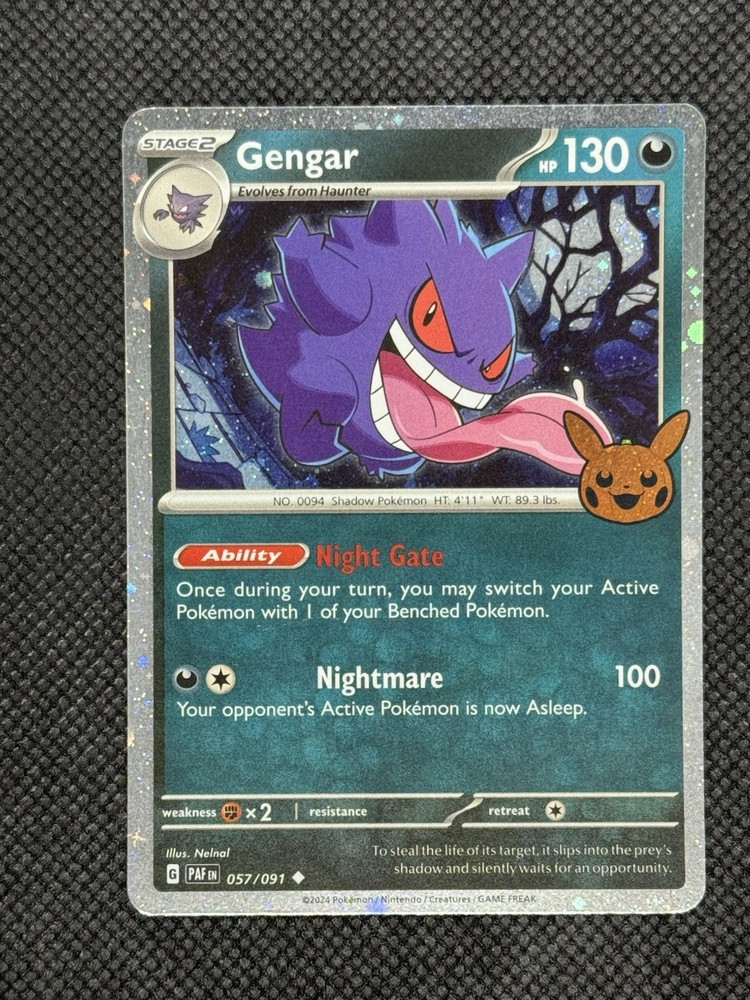 Delve into the world of Pokémon TCG with the Gengar (Cosmos Holo) card from the Trick or Trade 2024 set, the perfect addition to any collection. This Stage 2 Pokémon card showcases the iconic Gengar character in a stunning Cosmos Holo finish, complemented by a unique Halloween Stamp that makes it a standout piece. Crafted by The Pokémon Company and illustrated by the talented Nalnal, this card bears the number 057/091 and is part of the enchanting BOOster Bundle 2024 (TTBB24). Whether you're a seasoned collector or just starting, this card is sure to be a captivating highlight in your collection. Card has been well kept in sleeve/top-loader, is as pictured, and will be shipped in penny sleeve/card saver to keep your purchase safe and protected! I am happy to work with you on combining items to save on shipping, please feel free to reach out with a message. Enjoy and happy hunting!