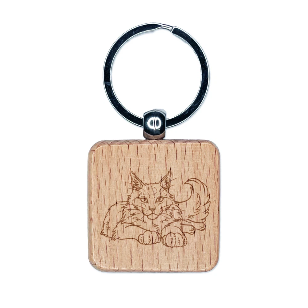 Gentle Maine Coon Cat Engraved Wood Square Keychain Tag Charm