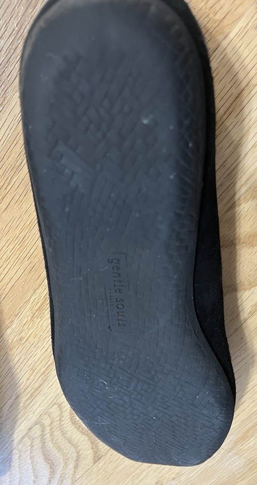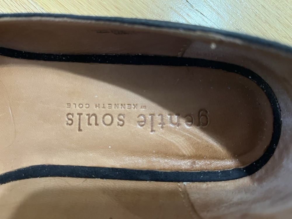 Gentle Souls by Kenneth Cole women’s slip-on flats. Black suede upper with laser cut detail. Size 10M. Pre-owned in good condition. Normal wear from use including light wear at the heel lining (see photos). Soles in good shape. Comfort cushioned Gentle Souls footbed. Internal: 001