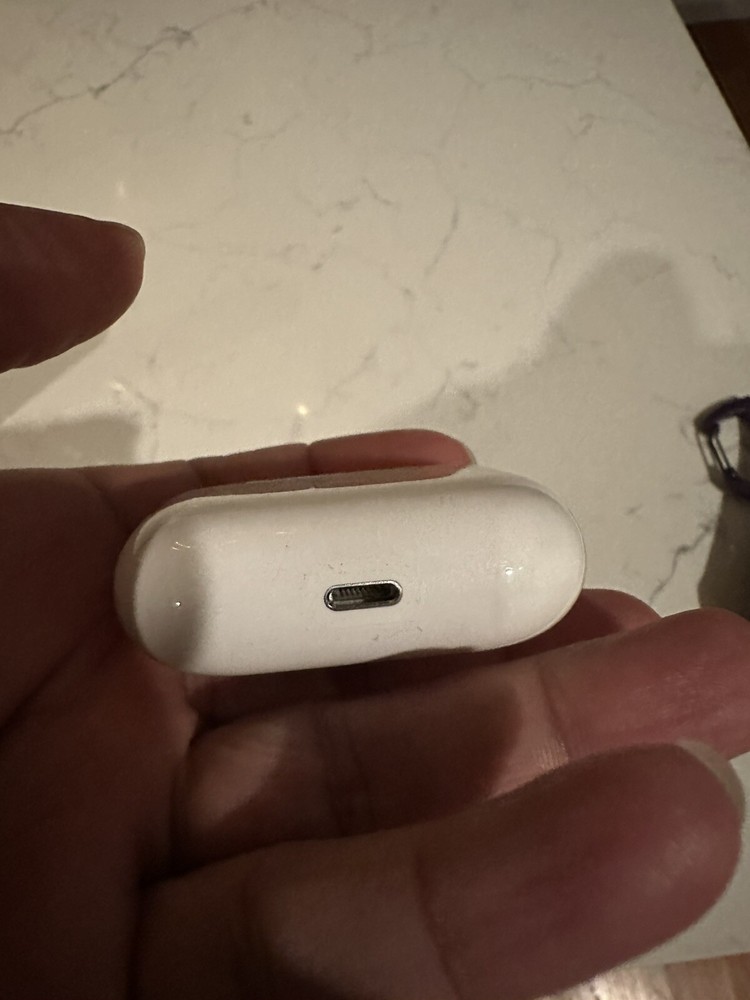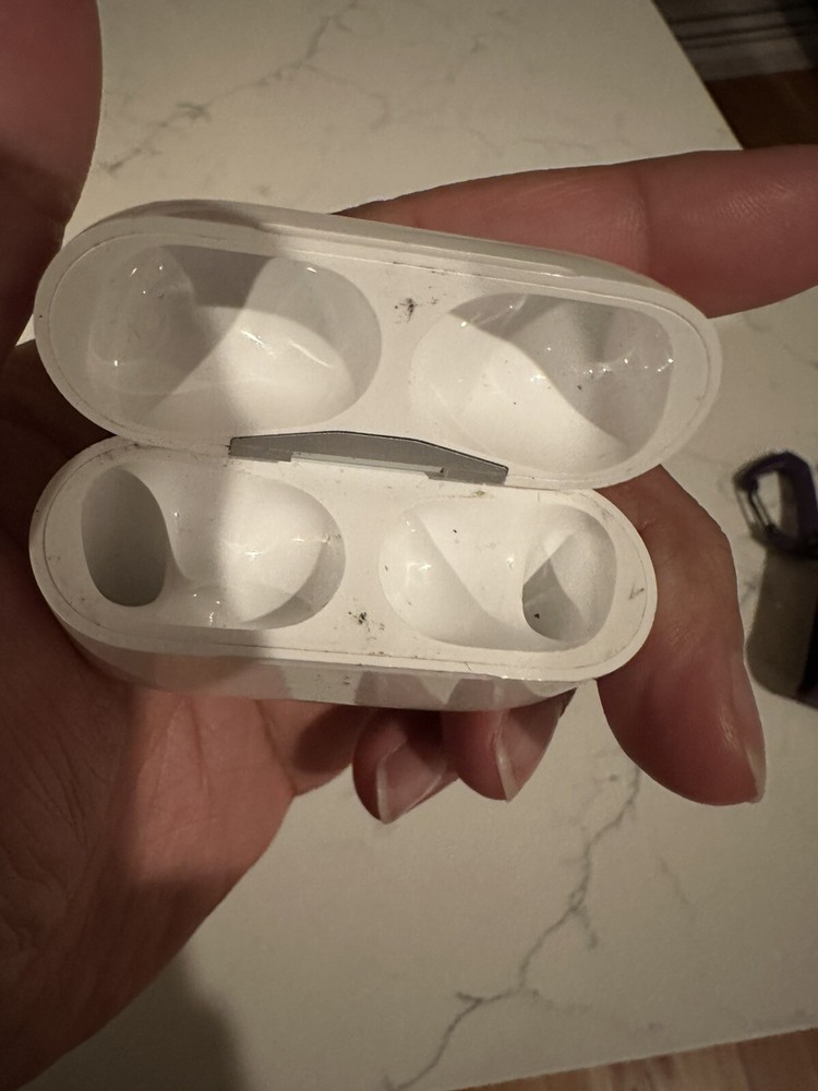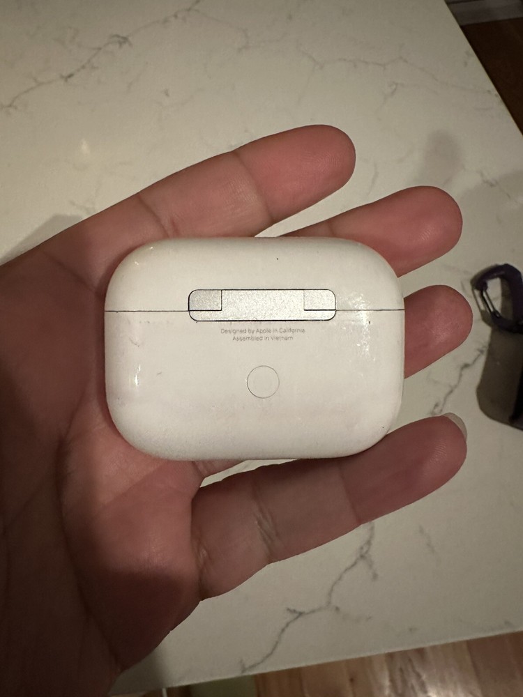 This is a genuine Apple AirPods Pro 1st Gen replacement charging case in white. It features a double earpiece design with Bluetooth connectivity, noise cancellation, water resistance, sweat-proofing, and a built-in microphone. The case is compact and designed for in-ear use, with rechargeable batteries and motion-detecting accelerometers. It is manufactured in China and is compatible with the Apple AirPods Pro model.