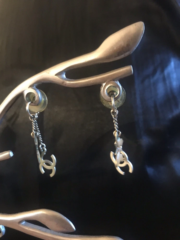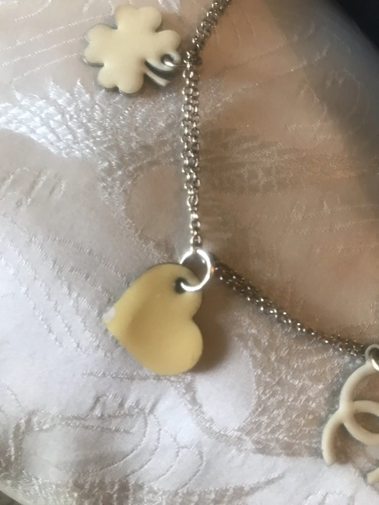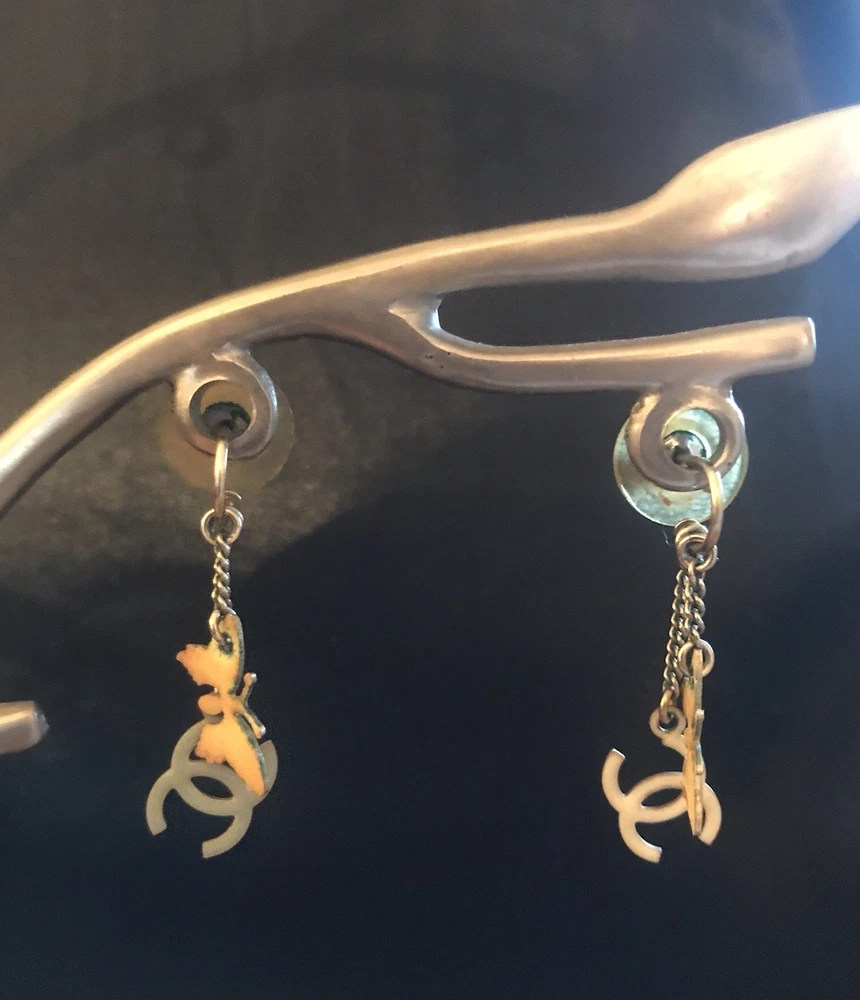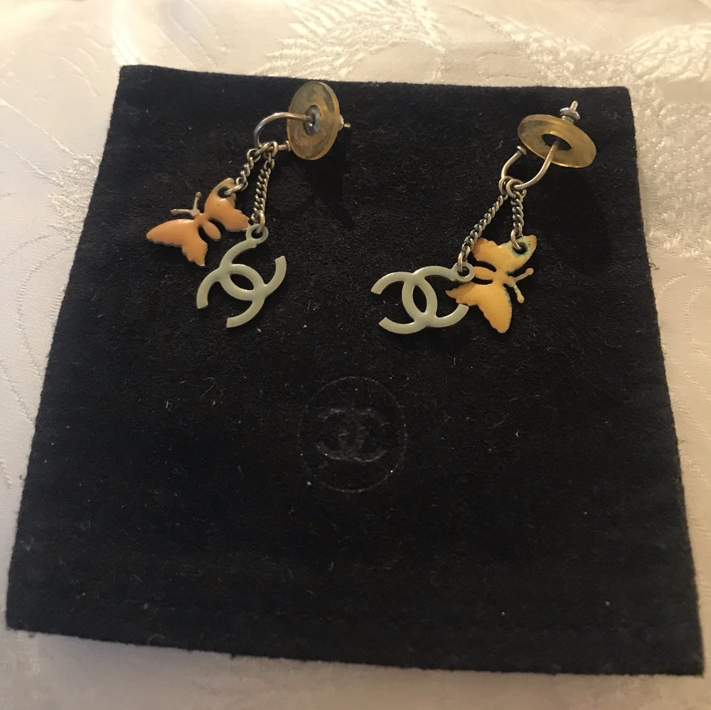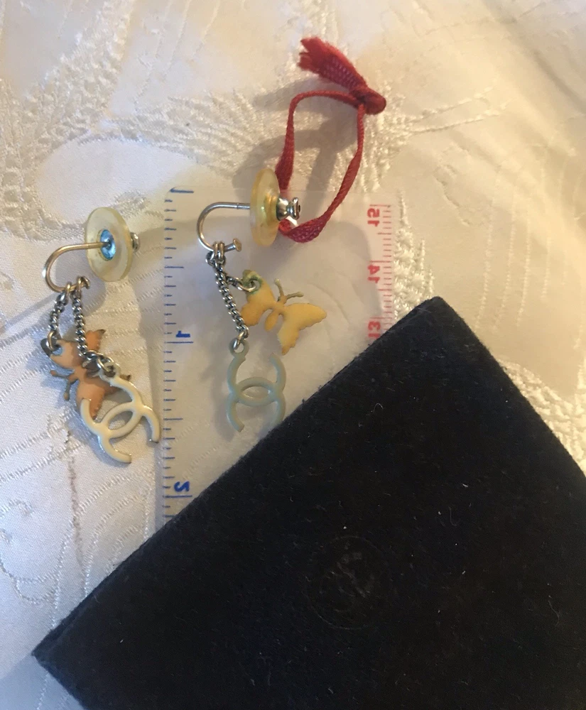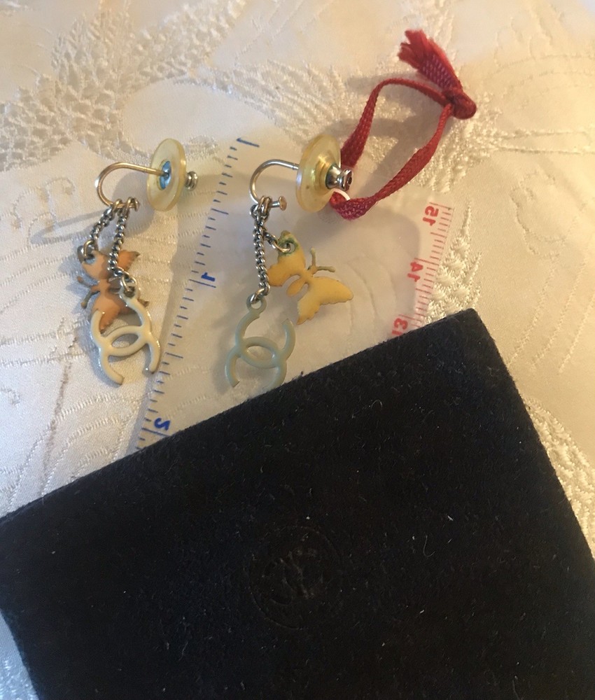 Signed on lobster claw clasp (copyright) CHANEL (registered) 08 CC P MADE IN ITALY. From the CHANEL Boutique off Robertson in West Hollywood (now closed) Spring Collection 2008. Pastel hearts, butterflies and CC logo stations in enamel on a double champagne golden chain. The earrings have that classic Chanel U shape with double chains of staggered lengths ending in butterflies and CC logos. True to CHANEL unique design, the clever detail of this is the charms are colored differently on each side, varying between white and muted tones of yellow pink and grey. The vibe is soft, youthful, feminine, whimsical and understated. The earrings are lightweight and comfortable. Being that this is 20 year old costume jewelry the condition reflects that and is figured into the price. The colors are a bit faded, some of the yellow enamel on one of the CC charms has peeled a bit, revealing the goldtone base, which is not such an issue on a reversible charm. The edge on the heart is not entirely smooth or tight, but appears integral. The box has definitely seen better days, it was in the the bottom of my jewelry box and has an imprint and fading, which I touched up with a Sharpie with mediocre results. Please kindly refer to the photos. Overall, a dainty, wearable cute set with lots of CC logos while keeping it classy. Looks expensive, especially due to the station design and that “just right” CHANEL esthetic.