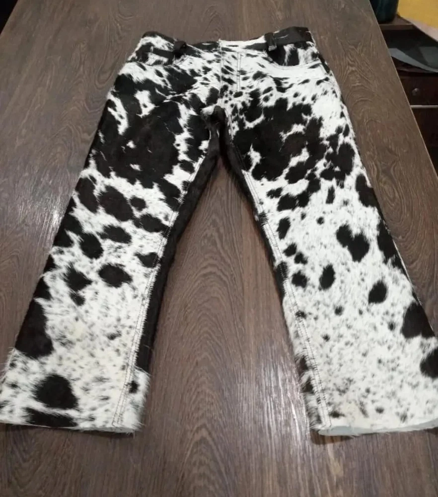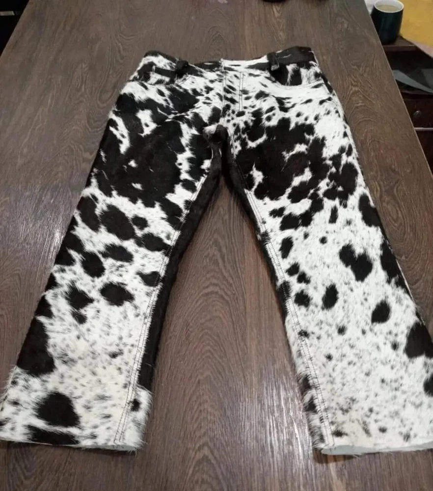 Unleash Your Western Spirit with Genuine Cowhide Hair on Hide Pants! Men’s and Women's Hair-On Cowhide Leather Pants – Real Cowhide, Natural Multicolor Design Please Note: Because cowhide is a natural material, each pair of pants is truly one of a kind, with unique patterns and variations that differ on every piece. Unleash bold Western charm with our Hair-On Cowhide Leather Pants, handcrafted from premium genuine cowhide leather with natural hair-on-hide detailing. These pants are more than just clothing—they’re a statement of rugged elegance, offering a perfect blend of style and functionality. Key Features: Genuine Cowhide Leather: Expertly crafted from high-quality, real hair-on cowhide leather for unmatched durability and luxurious comfort. Natural Multicolor Design: Showcases authentic cowskin patterns with natural hair-on-hide, ensuring each pair is unique with distinctive color variations. Classic Western Styling: Features a Western-inspired design, adding a touch of rustic sophistication to your wardrobe. Customizable Fit: Available in a variety of sizes, with an option for personalized tailoring to ensure a perfect, flattering fit. Versatile Wear: Ideal for rodeos, Western-themed events, or making a bold fashion statement in your everyday outfits. Perfect Gift: These pants make an excellent one-of-a-kind gift for anyone who appreciates authentic Western style and high-quality craftsmanship. Size & Fit: Please refer to our size chart for accurate sizing. Keep in mind that cowhide leather molds naturally to your shape over time for a personalized fit. Care Instructions: To preserve the natural hair-on-hide quality, professional cleaning is recommended. Elevate your wardrobe with these one-of-a-kind cowhide leather pants, designed for those who value authenticity, durability, and bold style. With their natural multicolor patterns and handcrafted quality, these pants celebrate the timeless beauty of genuine cowhide. Own your style today – because true Western fashion never goes out of trend!