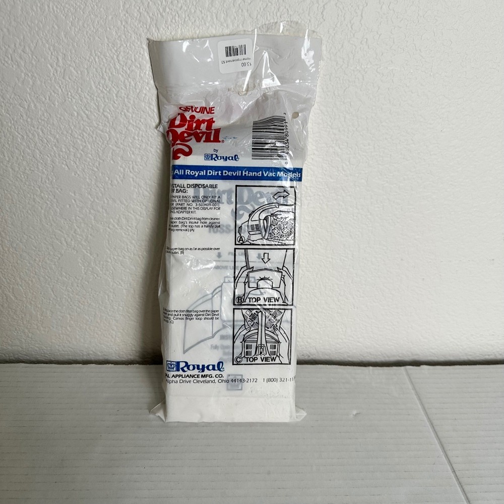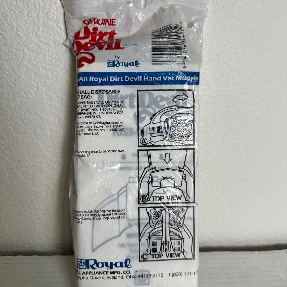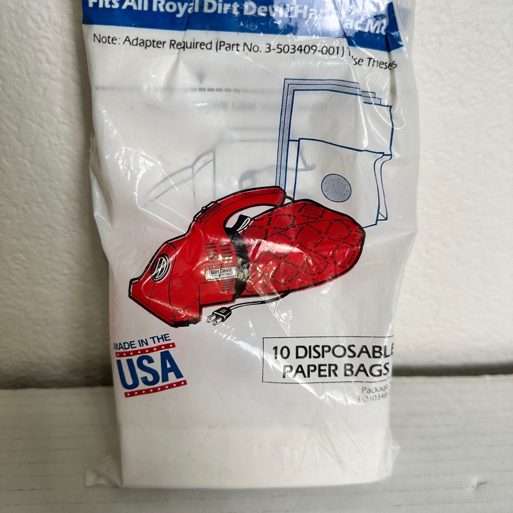 A pack of ten genuine Dirt Devil disposable paper bags, designed for Royal Dirt Devil hand vacuum models. These bags offer a convenient and hygienic solution for maintaining your handheld vacuum cleaner. Each bag is designed for single use and easy disposal, ensuring a clean and efficient cleaning experience. Package opened but none were used, Compatible Brand: Royal, For Royal, Dirt Devil, For Dirt Devil Compatible Model: Universal Number in Pack: 10 Number of Items in Set: 10 Type: Vacuum Cleaner Bags Set Includes: Vacuum Cleaner Bags Keywords: Dirt Devil, Royal, Hand Vac, Vacuum Bags, Disposable Bags, Vacuum Cleaner Bags, Handheld Vacuum, Genuine Dirt Devil, Vacuum Accessories, Paper Bags, Vacuum Cleaner Parts, New, Cleaning