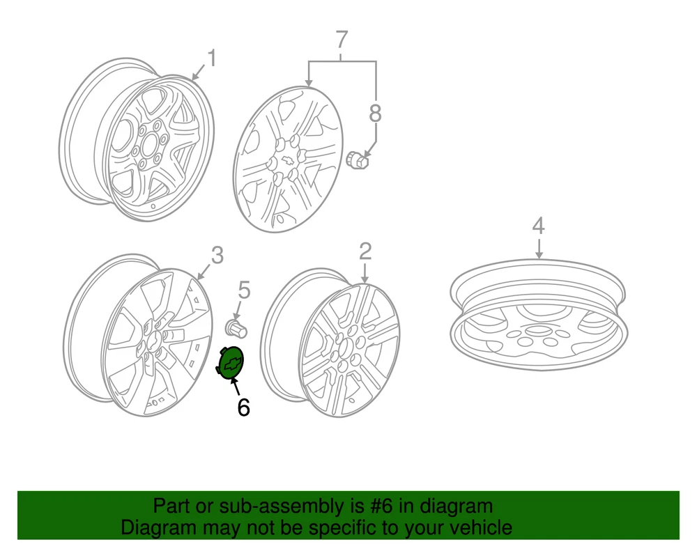 aaronchevrolet Genuine GM Button Style Center Cap with Bowtie Logo 09598035 Part can be found as # 6 in the diagram above Product Description 18 wheel. Helps protect your vehicle's wheel hub, cv shaft (if equipped), and wheel fasteners from dust and moisture Helps enhance vehicle appearance This GM Genuine Part is designed, engineered, and tested to rigorous standards and is backed by General Motors Specifications Brand GM Manufacturer Part Number 09598035 SKU 09598035 Product Genuine GM Button Style Center Cap with Bowtie Logo 09598035 ONLY PART REFERENCE #6 ON THE DIAGRAM IS INCLUDED WARNING : May cause cancer and reproductive harm. See www.P65Warnings.ca.gov for more info. Terms and Conditions Thank you for shopping with us. Please find our policies below. If you have any other questions, please don't hesitate to contact us. Shipping Terms If you are located in Alaska, Hawaii or Puerto Rico Please contact us via eBay email to discuss shipping cost In stock orders ship within 24 hours. Weekend orders will be processed the next business day. If a part is not in stock and must be ordered from the manufacturer, it usually takes 2-3 days to arrive to us and will be promptly shipped to you. Most of the orders are shipped complete within 2-3 business days. A few of the parts ordered from the manufacturer may take up to 5-6 business days to arrive and will shipped to you immediately. Depending upon location, ground shipments usually take 2-7 days. Your order may be shipped Overnight for an additional cost. Oversized shipments will be additional; you will be contacted prior to shipping for approval. We cannot guarantee transit times for ground and oversize orders. Shipping Carrier substitutions may be made at our determination in an attempt to reduce shipping cost to the customer. We do not ship internationally. In the unlikely event that a part has been placed on backorder or discontinued, we will do our best to try and find one for you as quickly as possible. We do not ship COD orders. Return Policy Contact us to arrange for any returns. A copy of the invoice will need to be included with the return. Parts must be resaleable and in the original packaging. We cannot take back used parts. We cannot take back installed or tried parts. Electrical parts are not returnable. We do reserve the right to refuse and return any parts we find have been installed, are used or do not meet the above criteria. Return request need to be within 30 days of receipt. Cancellation Policy An order or a portion of an order may be cancelled up until the time it is shipped and no longer in our possession. Home • Newsletter Signup • Contact Us Copyright © 2025 aaronchevrolet , All rights reserved. Solution by RevolutionParts, Inc. :: Design by OCDesignsOnline