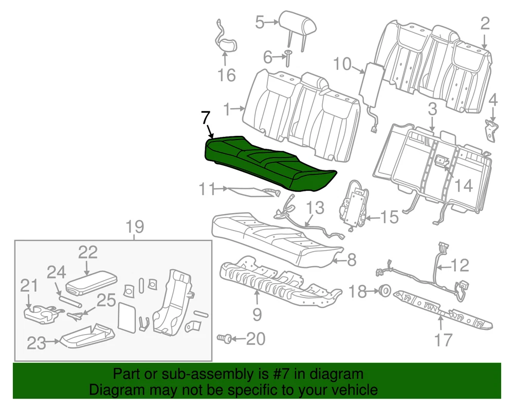 aaronchevrolet Genuine GM Ebony Rear Seat Cushion Cover 15216612 Part can be found as # 7 in the diagram above Product Description Without LUMBAR. with seat heater black. Designed for an exact fit to prevent movement on the cushions Available in multiple colors to match the vehicle's interior trim package This GM Genuine Part is designed, engineered, and tested to rigorous standards and is backed by General Motors Collision parts are designed to help promote proper and safe repair Specifications Brand GM Manufacturer Part Number 15216612 SKU 15216612 Product Genuine GM Ebony Rear Seat Cushion Cover 15216612 ONLY PART REFERENCE #7 ON THE DIAGRAM IS INCLUDED WARNING : May cause cancer and reproductive harm. See www.P65Warnings.ca.gov for more info. Terms and Conditions Thank you for shopping with us. Please find our policies below. If you have any other questions, please don't hesitate to contact us. Shipping Terms If you are located in Alaska, Hawaii or Puerto Rico Please contact us via eBay email to discuss shipping cost In stock orders ship within 24 hours. Weekend orders will be processed the next business day. If a part is not in stock and must be ordered from the manufacturer, it usually takes 2-3 days to arrive to us and will be promptly shipped to you. Most of the orders are shipped complete within 2-3 business days. A few of the parts ordered from the manufacturer may take up to 5-6 business days to arrive and will shipped to you immediately. Depending upon location, ground shipments usually take 2-7 days. Your order may be shipped Overnight for an additional cost. Oversized shipments will be additional; you will be contacted prior to shipping for approval. We cannot guarantee transit times for ground and oversize orders. Shipping Carrier substitutions may be made at our determination in an attempt to reduce shipping cost to the customer. We do not ship internationally. In the unlikely event that a part has been placed on backorder or discontinued, we will do our best to try and find one for you as quickly as possible. We do not ship COD orders. Return Policy Contact us to arrange for any returns. A copy of the invoice will need to be included with the return. Parts must be resaleable and in the original packaging. We cannot take back used parts. We cannot take back installed or tried parts. Electrical parts are not returnable. We do reserve the right to refuse and return any parts we find have been installed, are used or do not meet the above criteria. Return request need to be within 30 days of receipt. Cancellation Policy An order or a portion of an order may be cancelled up until the time it is shipped and no longer in our possession. Home • Newsletter Signup • Contact Us Copyright © 2025 aaronchevrolet , All rights reserved. Solution by RevolutionParts, Inc. :: Design by OCDesignsOnline