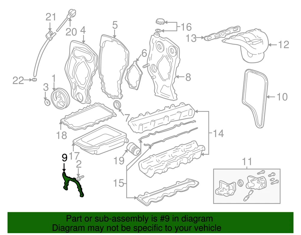 VRAY-GMC Genuine GM Engine Timing Chain Housing Gasket Kit 12360464 Part can be found as # 9 in the diagram above Product Description All models. 2.4L. This GM Genuine Part is designed, engineered, and tested to rigorous standards and is backed by General Motors Specifications Brand GM Manufacturer Part Number 12360464 SKU 12360464 Product Genuine GM Engine Timing Chain Housing Gasket Kit 12360464 ONLY PART REFERENCE #9 ON THE DIAGRAM IS INCLUDED WARNING : May cause cancer and reproductive harm. See www.P65Warnings.ca.gov for more info. Terms and Conditions Thank you for shopping with us. Please find our policies below. If you have any other questions, please don't hesitate to contact us. Shipping Terms In stock orders ship within 24 hours. Weekend orders will be processed the next business day. If a part is not in stock and must be ordered from the manufacturer, it usually takes 2-3 days to arrive to us and will be promptly shipped to you. Most of the orders are shipped complete within 2-3 business days. A few of the parts ordered from the manufacturer may take up to 5-6 business days to arrive and will shipped to you immediately. Depending upon location, ground shipments usually take 2-7 days. Your order may be shipped Overnight for an additional cost. Oversized shipments will be additional; you will be contacted prior to shipping for approval. We cannot guarantee transit times for ground and oversize orders. Shipping Carrier substitutions may be made at our determination in an attempt to reduce shipping cost to the customer. We do not ship internationally. In the unlikely event that a part has been placed on backorder or discontinued, we will do our best to try and find one for you as quickly as possible. We do not ship COD orders. Return Policy Contact us to arrange for any returns. A copy of the invoice will need to be included with the return. Parts must be resaleable and in the original packaging. We cannot take back used parts. We cannot take back installed or tried parts. Electrical parts are not returnable. We do reserve the right to refuse and return any parts we find have been installed, are used or do not meet the above criteria. Return request need to be within 30 days of receipt. Cancellation Policy An order or a portion of an order may be cancelled up until the time it is shipped and no longer in our possession. Home • Newsletter Signup • Contact Us Copyright © 2024 VRAY-GMC , All rights reserved. Solution by RevolutionParts, Inc. :: Design by OCDesignsOnline