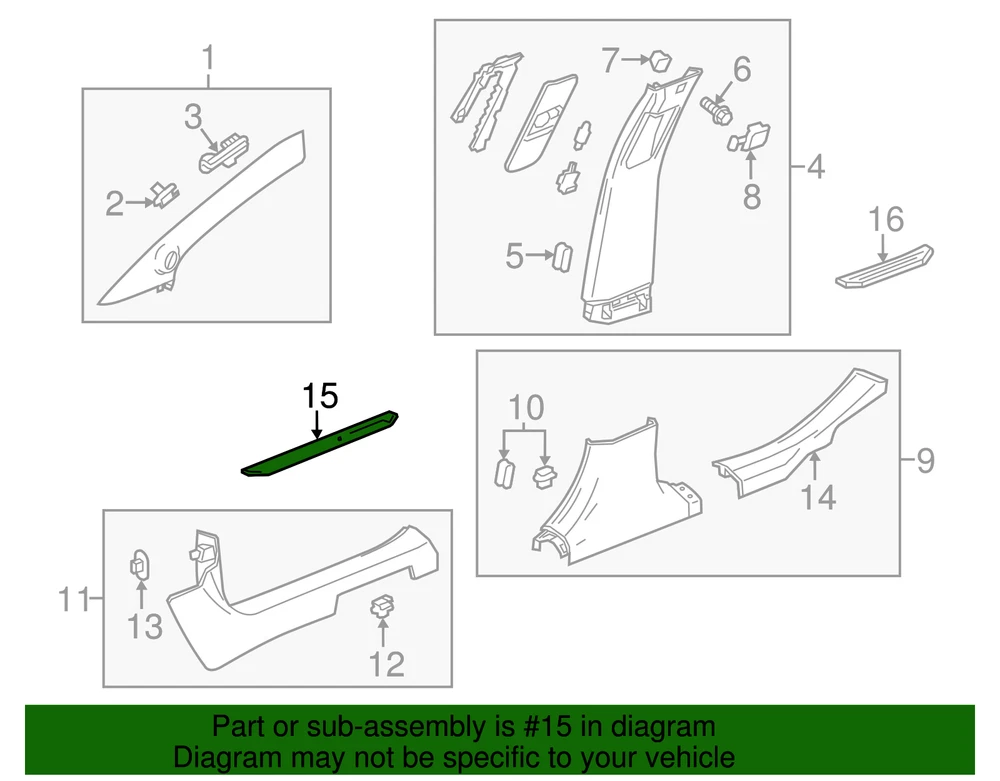 vanceautogroupofwoodward Genuine GM Front Driver Side Door Sill Trim Plate 22923697 Part can be found as # 15 in the diagram above Product Description Front. Helps enhance the appearance of your vehicle's interior threshold This GM Genuine Part is designed, engineered, and tested to rigorous standards and is backed by General Motors Collision parts are designed to help promote proper and safe repair Specifications Brand GM Manufacturer Part Number 22923697 SKU 22923697 Product Genuine GM Front Driver Side Door Sill Trim Plate 22923697 Replaces 20997921 ONLY PART REFERENCE #15 ON THE DIAGRAM IS INCLUDED WARNING : May cause cancer and reproductive harm. See www.P65Warnings.ca.gov for more info. Terms and Conditions Thank you for shopping with us. Please find our policies below. If you have any other questions, please don't hesitate to contact us. Shipping Terms If located in Alaska, Hawaii, and Puerto Rico Please contact US via eBay email for pricing In stock orders ship within 24 hours. Weekend orders will be processed the next business day. If a part is not in stock and must be ordered from the manufacturer, it usually takes 2-3 days to arrive to us and will be promptly shipped to you. Most of the orders are shipped complete within 2-3 business days. A few of the parts ordered from the manufacturer may take up to 5-6 business days to arrive and will shipped to you immediately. Depending upon location, ground shipments usually take 2-7 days. Your order may be shipped Overnight for an additional cost. Oversized shipments will be additional; you will be contacted prior to shipping for approval. We cannot guarantee transit times for ground and oversize orders. Shipping Carrier substitutions may be made at our determination in an attempt to reduce shipping cost to the customer. We do not ship internationally. In the unlikely event that a part has been placed on backorder or discontinued, we will do our best to try and find one for you as quickly as possible. We do not ship COD orders. Return Policy Contact us to arrange for any returns. A copy of the invoice will need to be included with the return. Parts must be resaleable and in the original packaging. We cannot take back used parts. We cannot take back installed or tried parts. Electrical parts are not returnable. We do reserve the right to refuse and return any parts we find have been installed, are used or do not meet the above criteria. Return request need to be within 30 days of receipt. Cancellation Policy An order or a portion of an order may be cancelled up until the time it is shipped and no longer in our possession. Home • Newsletter Signup • Contact Us Copyright © 2025 vanceautogroupofwoodward , All rights reserved. Solution by RevolutionParts, Inc. :: Design by OCDesignsOnline