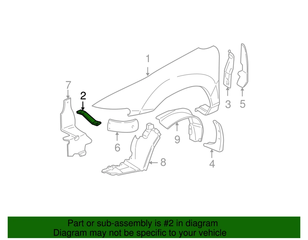 VRAY-GMC Genuine GM Front Driver Side Fender Front Upper Bracket 22603245 Part can be found as # 2 in the diagram above Product Description Front. Helps align and secure your vehicle's fender This GM Genuine Part is designed, engineered, and tested to rigorous standards and is backed by General Motors Collision parts are designed to help promote proper and safe repair Specifications Brand GM Manufacturer Part Number 22603245 SKU 22603245 Product Genuine GM Front Driver Side Fender Front Upper Bracket 22603245 ONLY PART REFERENCE #2 ON THE DIAGRAM IS INCLUDED WARNING : May cause cancer and reproductive harm. See www.P65Warnings.ca.gov for more info. Terms and Conditions Thank you for shopping with us. Please find our policies below. If you have any other questions, please don't hesitate to contact us. Shipping Terms In stock orders ship within 24 hours. Weekend orders will be processed the next business day. If a part is not in stock and must be ordered from the manufacturer, it usually takes 2-3 days to arrive to us and will be promptly shipped to you. Most of the orders are shipped complete within 2-3 business days. A few of the parts ordered from the manufacturer may take up to 5-6 business days to arrive and will shipped to you immediately. Depending upon location, ground shipments usually take 2-7 days. Your order may be shipped Overnight for an additional cost. Oversized shipments will be additional; you will be contacted prior to shipping for approval. We cannot guarantee transit times for ground and oversize orders. Shipping Carrier substitutions may be made at our determination in an attempt to reduce shipping cost to the customer. We do not ship internationally. In the unlikely event that a part has been placed on backorder or discontinued, we will do our best to try and find one for you as quickly as possible. We do not ship COD orders. Return Policy Contact us to arrange for any returns. A copy of the invoice will need to be included with the return. Parts must be resaleable and in the original packaging. We cannot take back used parts. We cannot take back installed or tried parts. Electrical parts are not returnable. We do reserve the right to refuse and return any parts we find have been installed, are used or do not meet the above criteria. Return request need to be within 30 days of receipt. Cancellation Policy An order or a portion of an order may be cancelled up until the time it is shipped and no longer in our possession. Home • Newsletter Signup • Contact Us Copyright © 2025 VRAY-GMC , All rights reserved. Solution by RevolutionParts, Inc. :: Design by OCDesignsOnline