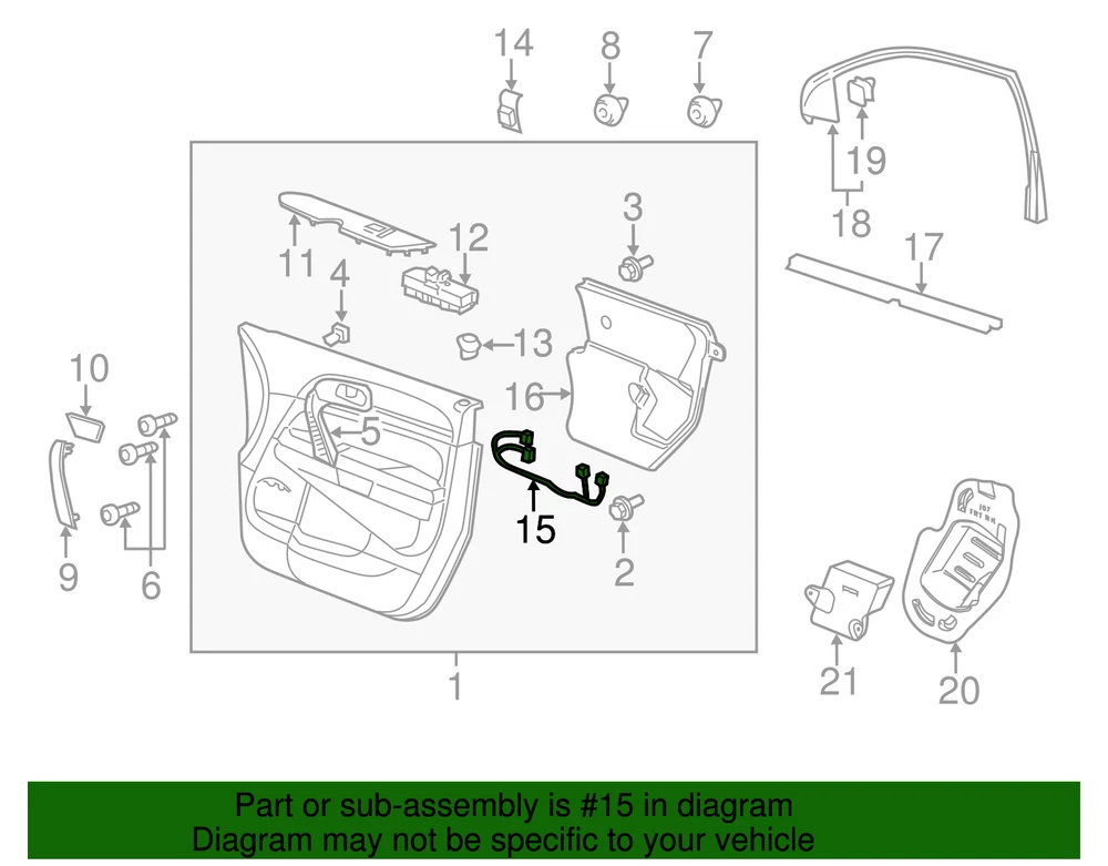 VRAY-GMC Genuine GM Harness Assembly-Front S/D Dr Lk & P/W & O/S R 20762634 Part can be found as # 15 in the diagram above Specifications Brand GM Manufacturer Part Number 20762634 SKU 20762634 Product Genuine GM Harness Assembly-Front S/D Dr Lk & P/W & O/S R 20762634 Replaces 25968589 ONLY PART REFERENCE #15 ON THE DIAGRAM IS INCLUDED WARNING : May cause cancer and reproductive harm. See www.P65Warnings.ca.gov for more info. Terms and Conditions Thank you for shopping with us. Please find our policies below. If you have any other questions, please don't hesitate to contact us. Shipping Terms In stock orders ship within 24 hours. Weekend orders will be processed the next business day. If a part is not in stock and must be ordered from the manufacturer, it usually takes 2-3 days to arrive to us and will be promptly shipped to you. Most of the orders are shipped complete within 2-3 business days. A few of the parts ordered from the manufacturer may take up to 5-6 business days to arrive and will shipped to you immediately. Depending upon location, ground shipments usually take 2-7 days. Your order may be shipped Overnight for an additional cost. Oversized shipments will be additional; you will be contacted prior to shipping for approval. We cannot guarantee transit times for ground and oversize orders. Shipping Carrier substitutions may be made at our determination in an attempt to reduce shipping cost to the customer. We do not ship internationally. In the unlikely event that a part has been placed on backorder or discontinued, we will do our best to try and find one for you as quickly as possible. We do not ship COD orders. Return Policy Contact us to arrange for any returns. A copy of the invoice will need to be included with the return. Parts must be resaleable and in the original packaging. We cannot take back used parts. We cannot take back installed or tried parts. Electrical parts are not returnable. We do reserve the right to refuse and return any parts we find have been installed, are used or do not meet the above criteria. Return request need to be within 30 days of receipt. Cancellation Policy An order or a portion of an order may be cancelled up until the time it is shipped and no longer in our possession. Home • Newsletter Signup • Contact Us Copyright © 2025 VRAY-GMC , All rights reserved. Solution by RevolutionParts, Inc. :: Design by OCDesignsOnline