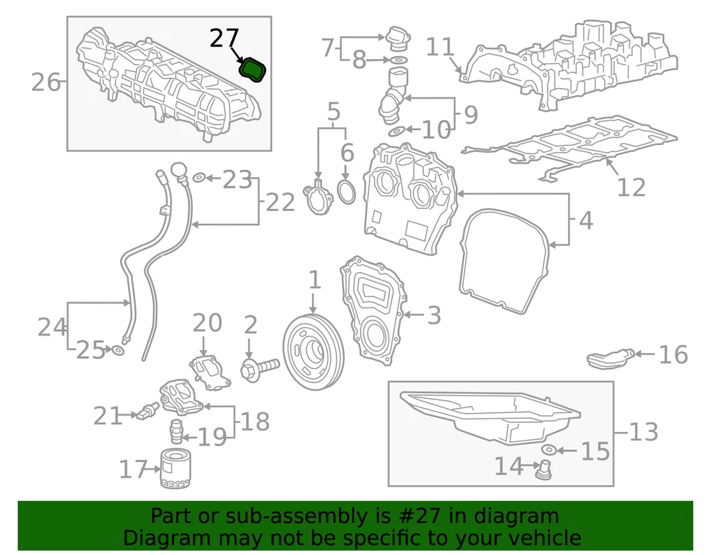 VRAY-GMC Genuine GM Intake Manifold Gasket 12663540 Part can be found as # 27 in the diagram above Product Description Silverado, sierra. 2.7l. 2.7L turbo, large. CT4. 2.7l. Intake runner gasket. This GM Genuine Part is designed, engineered, and tested to rigorous standards and is backed by General Motors . Specifications Brand GM Manufacturer Part Number 12663540 SKU 12663540 Product Genuine GM Intake Manifold Gasket 12663540 ONLY PART REFERENCE #27 ON THE DIAGRAM IS INCLUDED WARNING : May cause cancer and reproductive harm. See www.P65Warnings.ca.gov for more info. Terms and Conditions Thank you for shopping with us. Please find our policies below. If you have any other questions, please don't hesitate to contact us. Shipping Terms In stock orders ship within 24 hours. Weekend orders will be processed the next business day. If a part is not in stock and must be ordered from the manufacturer, it usually takes 2-3 days to arrive to us and will be promptly shipped to you. Most of the orders are shipped complete within 2-3 business days. A few of the parts ordered from the manufacturer may take up to 5-6 business days to arrive and will shipped to you immediately. Depending upon location, ground shipments usually take 2-7 days. Your order may be shipped Overnight for an additional cost. Oversized shipments will be additional; you will be contacted prior to shipping for approval. We cannot guarantee transit times for ground and oversize orders. Shipping Carrier substitutions may be made at our determination in an attempt to reduce shipping cost to the customer. We do not ship internationally. In the unlikely event that a part has been placed on backorder or discontinued, we will do our best to try and find one for you as quickly as possible. We do not ship COD orders. Return Policy Contact us to arrange for any returns. A copy of the invoice will need to be included with the return. Parts must be resaleable and in the original packaging. We cannot take back used parts. We cannot take back installed or tried parts. Electrical parts are not returnable. We do reserve the right to refuse and return any parts we find have been installed, are used or do not meet the above criteria. Return request need to be within 30 days of receipt. Cancellation Policy An order or a portion of an order may be cancelled up until the time it is shipped and no longer in our possession. Home • Newsletter Signup • Contact Us Copyright © 2025 VRAY-GMC , All rights reserved. Solution by RevolutionParts, Inc. :: Design by OCDesignsOnline