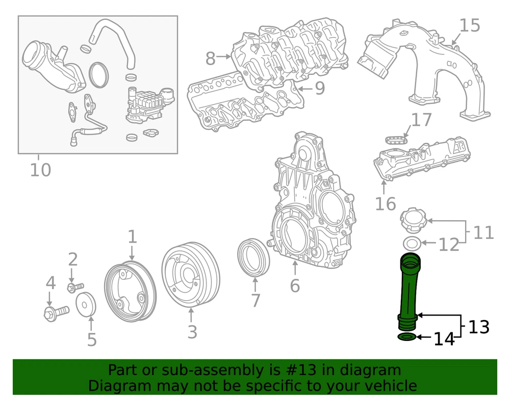 aaronchevrolet Genuine GM Oil Filler Tube 12695942 Part can be found as # 13 in the diagram above Product Description 6.6L diesel, upper components. This GM Genuine Part is designed, engineered, and tested to rigorous standards and is backed by General Motors Specifications Brand GM Manufacturer Part Number 12695942 SKU 12695942 Product Genuine GM Oil Filler Tube 12695942 ONLY PART REFERENCE #13 ON THE DIAGRAM IS INCLUDED WARNING : May cause cancer and reproductive harm. See www.P65Warnings.ca.gov for more info. Terms and Conditions Thank you for shopping with us. Please find our policies below. If you have any other questions, please don't hesitate to contact us. Shipping Terms If you are located in Alaska, Hawaii or Puerto Rico Please contact us via eBay email to discuss shipping cost In stock orders ship within 24 hours. Weekend orders will be processed the next business day. If a part is not in stock and must be ordered from the manufacturer, it usually takes 2-3 days to arrive to us and will be promptly shipped to you. Most of the orders are shipped complete within 2-3 business days. A few of the parts ordered from the manufacturer may take up to 5-6 business days to arrive and will shipped to you immediately. Depending upon location, ground shipments usually take 2-7 days. Your order may be shipped Overnight for an additional cost. Oversized shipments will be additional; you will be contacted prior to shipping for approval. We cannot guarantee transit times for ground and oversize orders. Shipping Carrier substitutions may be made at our determination in an attempt to reduce shipping cost to the customer. We do not ship internationally. In the unlikely event that a part has been placed on backorder or discontinued, we will do our best to try and find one for you as quickly as possible. We do not ship COD orders. Return Policy Contact us to arrange for any returns. A copy of the invoice will need to be included with the return. Parts must be resaleable and in the original packaging. We cannot take back used parts. We cannot take back installed or tried parts. Electrical parts are not returnable. We do reserve the right to refuse and return any parts we find have been installed, are used or do not meet the above criteria. Return request need to be within 30 days of receipt. Cancellation Policy An order or a portion of an order may be cancelled up until the time it is shipped and no longer in our possession. Home • Newsletter Signup • Contact Us Copyright © 2025 aaronchevrolet , All rights reserved. Solution by RevolutionParts, Inc. :: Design by OCDesignsOnline