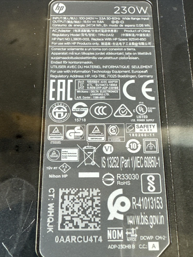 Output:19.5V 11.8A Input:100-240V~3.5A Power: 230W, DC pin size: 7.4*5.0mm (as the picture) Please make sure the output and DC pin size is suitable before you purchase Package Included: 1x Adapter 1x power cable Compatible for AC Power Adapter of HP: HP ENVY 27-B214 ALL-IN-ONE DESKTOP I7-8700T GTX1050 HP Envy 27-B021 i7-6700T AiO PC HP Envy 27-b011 AIO Desktop 27" i7-6700T GTX 950M HP Envy 27-B114 ALL-IN-ONE DESKTOP HP ENVY All-in-One 27-b209 i7-8700T GTX 1050 Omen by HP Laptop 17-AN120NR 17.3" i7-8750H GTX 1060 Gaming Laptop HP ENVY All-in-One 27-b255qd 27" 4K touch screen i7-8700T HP Envy 27-b205na 27" All-in-One PC i7-8700T HP Omen 17-W286CL Gaming Notebook HP Omen 17-w200na Z9D99EA 17.3" GTX 1070 Gaming Notebook/Laptop OMEN by HP 17-an011na 17.3inch FHD Gaming Laptop OMEN by HP 17-w250na i7-7700HQ GTX 1070 Gaming Laptop HP Omen Gaming 17 Notebook/Laptop i7-7700HQ GTX 1070 17-w273nr HP OMEN by HP 17-w104ng Gaming Notebook OMEN by HP 17-an042ng GTX 1070 i7 7700HQ 4K OMEN by HP 17-an042ng i7-7700HQ GTX 1070 17.3" 4K Gaming Notebook Omen by HP 17-an014ng Gaming Laptop GTX1070 i7 7700HQ HP ELITEBOOK 8770W HP ELITEBOOK 8770W PCNB HP EliteBook 8760w Mobile Workstation HP ZBOOK 17 HP ZBOOK 17 G2 PCNB HP ZBOOK 17 PCNB Note: Not all compatible model is listed.