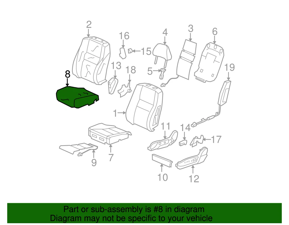 Fitment Type: Direct Replacement Product Name: Genuine Honda Cushion Cover 81531-TA5-A23ZA Brand: Honda Manufacturer Warranty: 1 Year Year: 2011 2012 Genuine OEM: Yes Make: Honda SKU: 81531-TA5-A23ZA Parts Included: ONLY PART REFERENCE #8 ON THE DIAGRAM IS INCLUDED Model: Accord Manufacturer Part Number: 81531-TA5-A23ZA