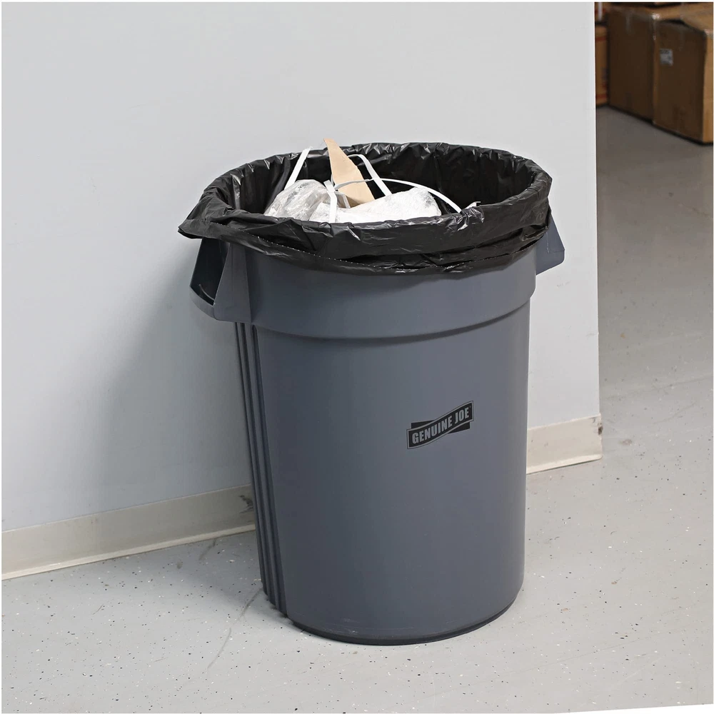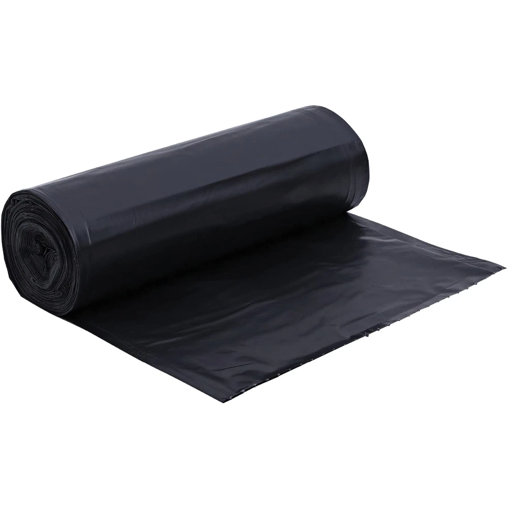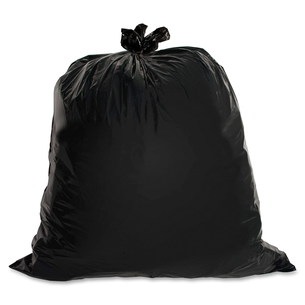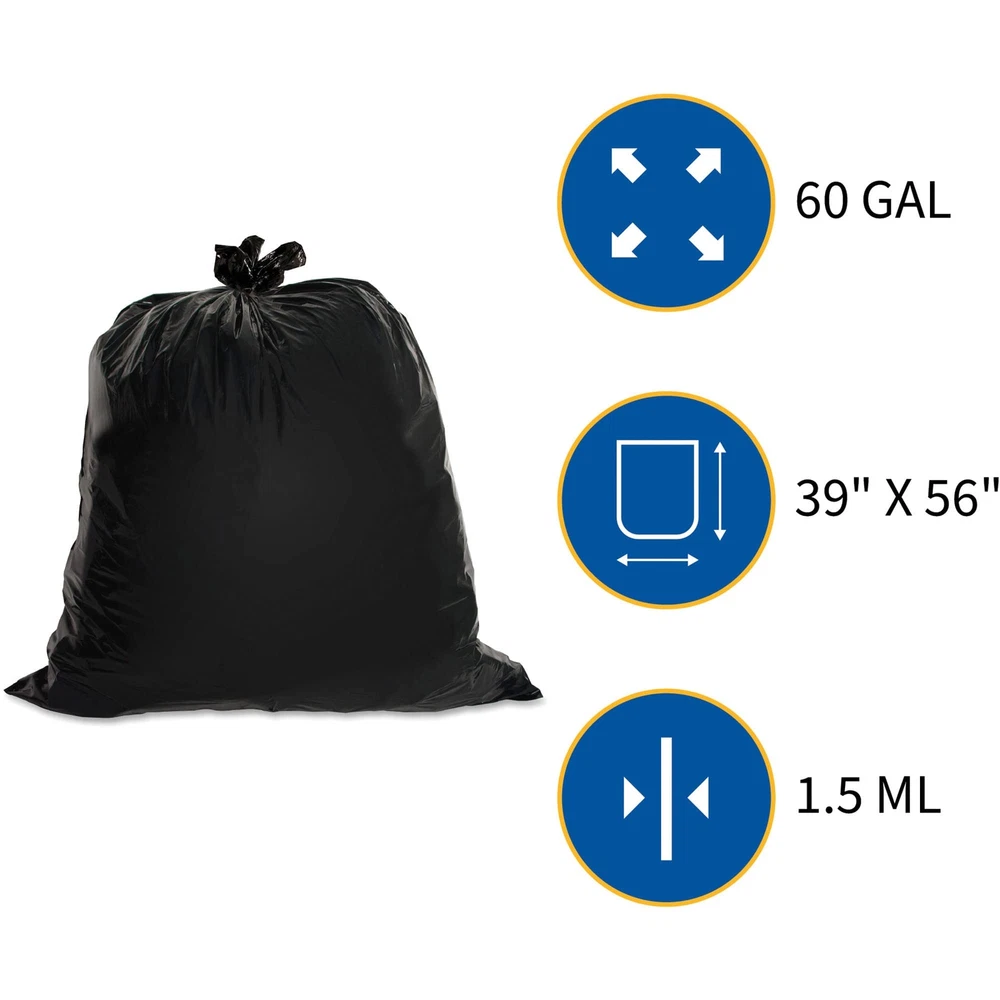 Extra-strong, heavy-duty trash bags are made with puncture-resistant resins and are three times more puncture-resistant than standard liners. They are ideal for extra-heavy trash applications, such as heavy food, office waste, boxes, cans and construction debris because they are puncture-resistant to sharp objects. Star-bottom seal is designed for a more even distribution of contents. Two-ply, low-density bags come in a convenient coreless roll for easy dispensing anywhere. The 1.5 mil thick bag holds 55 to 60 gallons. The bag size is 39" x 56". Black plastic resin conceals contents so, even if your janitorial crew collects garbage during regular work hours, you and your guests will not have to look at unsightly garbage. Sold as 50/Carton. Heavy-duty liner trash bags feature 1.55 mil thickness and are three times more puncture-resistant than standard can liners. 50 trash bags per box. Heavy bags are good for industrial waste, including sharp, heavy, and wet objects. The low-density plastic keeps heavy or wet trash from stretching holes in the bag. The 60 gal. bags fit large receptacles at your home or office. Star-sealed bottom for the best leak prevention. Black coloring keeps contents hidden. Heavy-duty bags hold your sharp or heavy objects without tearing.
