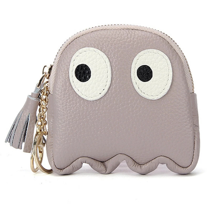 Reliable Quality: Top cowhide genuine leather soft to touch and easy to clean up, purely handmade. Professional Design: Small size 10*10*1.5cm and the weight is about 64g. Deft Design: 1 main pocket, 1 card slot,2 key chains, you can arrange credit card, driver's license, bank card, cash, change, lipstick, keys, etc. Attractive Design: Lovely cartoon ghost shape design. Reliable Reputation: If you are not satisfied with our product or service for any reason, please contact us, we will resolve it.