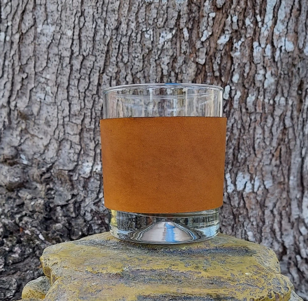Custom Leather glass sleeve handcrafted with top grain leather. Available in natural, bridle, light and dark brown, mahogany or black. Hand stitched to firmly fit with a comfortable feel. Slides on and off for convenient washing. Personalize your sleeve with a monogram. Choose your borders. Order a single glass with sleeve or get a pair. Beautifully wrapped. Don't want a monogram? No problem, message me for more information.
