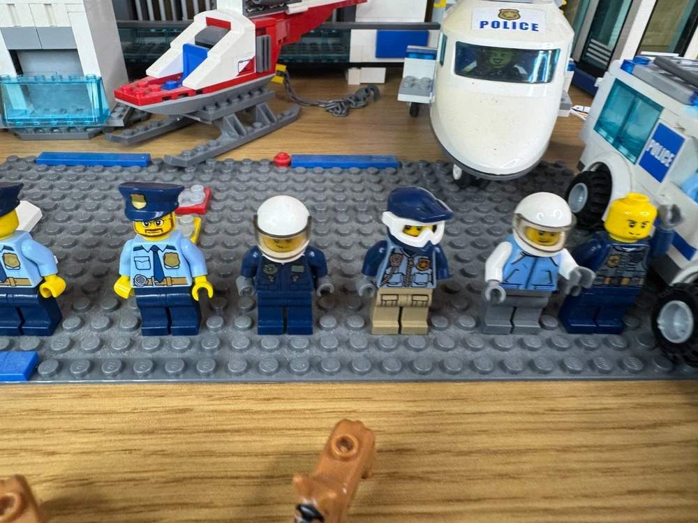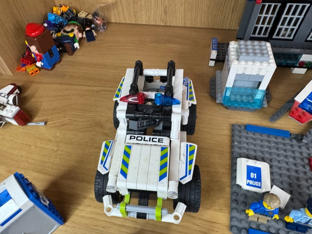 LEGO City Police Job Lot – Station, Helicopter, Plane, Vehicles, 7 Minifigures & 2 Dogs. A fantastic mixed LEGO City Police bundle – perfect for expanding your city layout or for imaginative play. Includes: Police station building Police helicopter Police plane Large police SUV Police van (02) Police quad bike & motorbike Portable jail / toilet unit 7 LEGO minifigures (police officers, pilots, criminals, etc.) 2 LEGO police dogs Extra accessories All pieces shown in the photos are included. Used but in good condition. May be missing some small parts compared to the original sets.