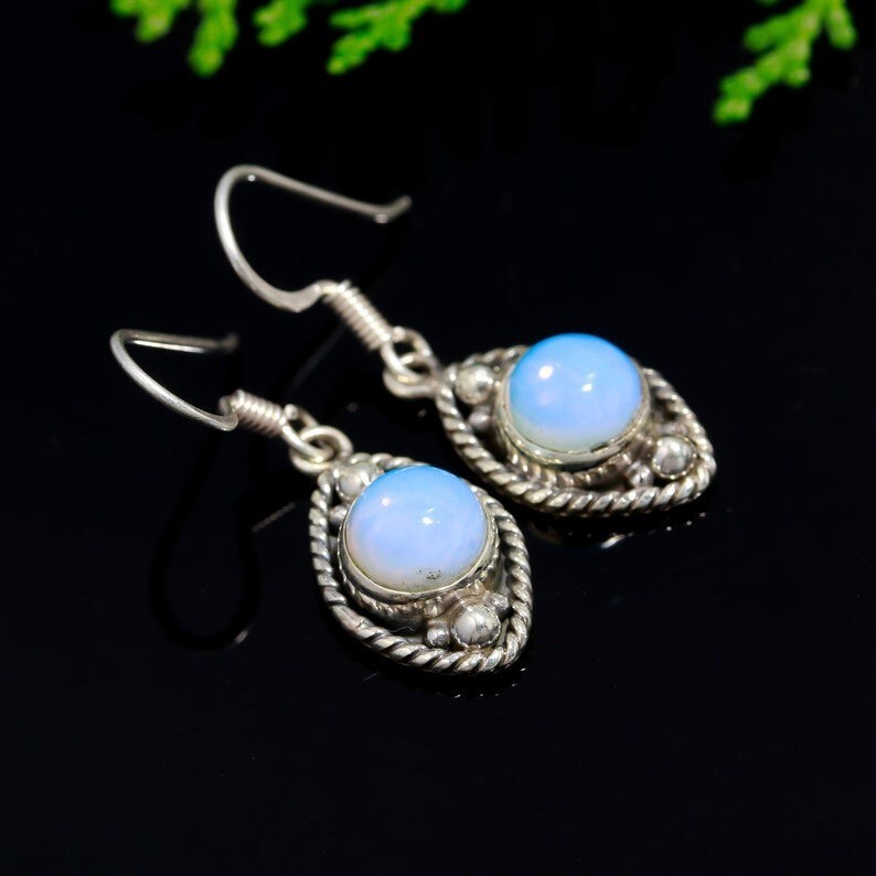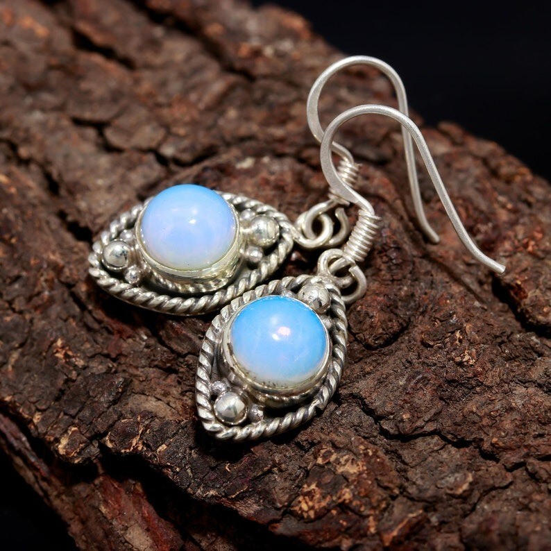 Setting Style: Bar Main Stone Shape: Cabochon Personalize: Yes Country of Origin: India Country/Region of Manufacture: India Occasion: Anniversary, Birthday, Christening, Christmas, Confirmation/Communion, Engagement, Father's Day, Graduation, Mother's Day, Valentine's Day, Wedding Material: Stone Brand: RabiyaJewels Ear Area: Lobe Metal: Silver Seller Warranty: Yes Theme: Beauty, Bohemian, Ethnic, Love Gemstone Clarity Grade: Eye Clean Base Metal: Silver Signed: Yes Main Stone Color: White Era: Art Deco (1915-1935) Closure: Hook Features: Engraved, Nickel-Free, Stackable Style: Dangle/Drop Cut Grade: Excellent Main Stone Creation: Natural Type: Earrings Metal Purity: 925 Number of Gemstones: 1 Shape: Round Wholesale: Yes Main Stone Treatment: Not Enhanced Vintage: Yes Main Stone: Opalite Secondary Stone: No Stone Color: Silver Handmade: Yes