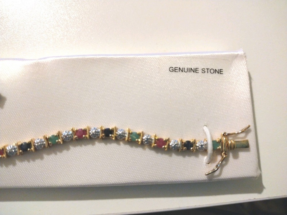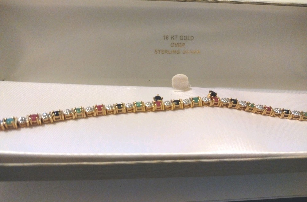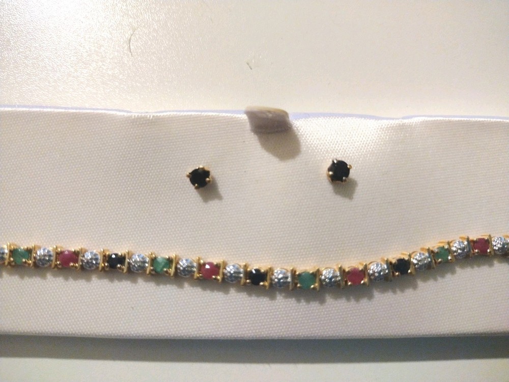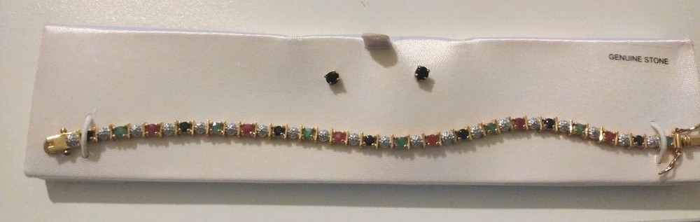 *Estate Find *Earrings are studs ** Bracelet is 7" long This is a genuine stone bracelet with an 18K gold over sterling silver base. The bracelet features a multicolor main stone with a variety of stones used in its design. It comes with stud earrings and is presented as a gift. The bracelet is suitable for various occasions such as engagement, graduation, birthday, wedding, anniversary, Christmas, Valentine's Day, and Mother's Day. We use our pictures as part of our condition and description on each item. This item may need to be polished or cleaned as we try to keep everything how we found the item. Volume pricing is turned on for multiple great deals. The more you purchase the more you save. Combined shipping on orders is always available! *Props are not included, such as jewelry boxes, earring holders, ECT... ** Please follow the Generations of Jewels store so that you are notified of new items!!!! ***No returns on International Sales!!! International Shipping will ONLY be through Global Shipping!!!!