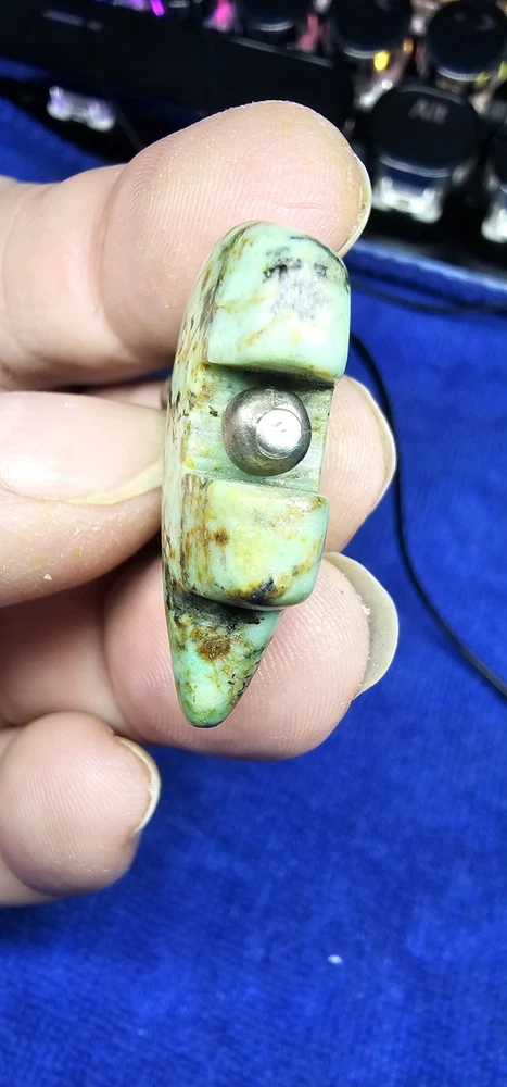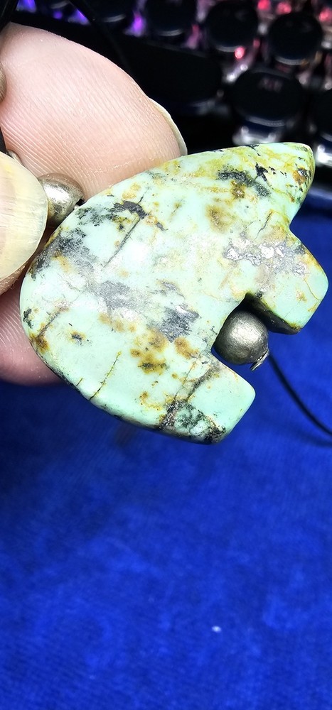 This handcrafted necklace features a genuine turquoise bear fetish pendant, symbolizing strength and healing in Native American tradition. The turquoise is cold to the touch, resists scratching, and shows a natural waxy matrix—signs of authentic, untreated or lightly stabilized turquoise. The bear is strung on a 15.5" drop cord (31" total length) with hematite-style barrel beads and brass-tone accents, creating an earthy, tribal aesthetic. Perfect for collectors of Southwestern or symbolic jewelry. 🔹 Authentic turquoise (tested, not dyed or composite) 🔹 Hand-carved bear with natural matrix 🔹 15.5" drop — great layering length 🔹 Spiritual and meaningful design --- Item Specifics: Condition: Pre-Owned Main Stone: Genuine Turquoise Stone Shape: Carved Bear Fetish Material: Turquoise, Brass-Tone Beads, Hematite-Style Barrel Beads, Black Cord Color: Green-Blue with Natural Matrix Pendant Size: Approx. 1.5" wide Necklace Length: 15.5" drop (approx. 31" total length) Closure: Slip-on (no clasp) Style: Tribal / Boho / Native American-Inspired Artisan Made: Unknown Country of Origin: Likely USA or Southwest Region