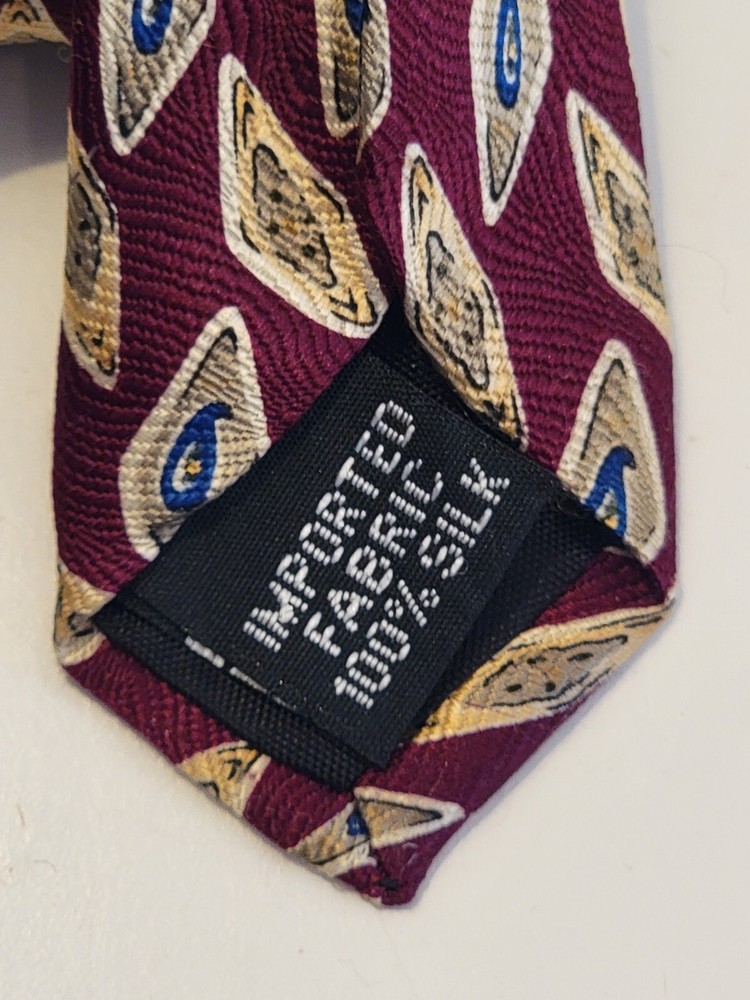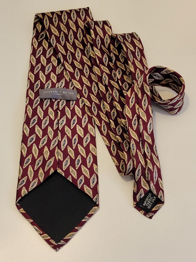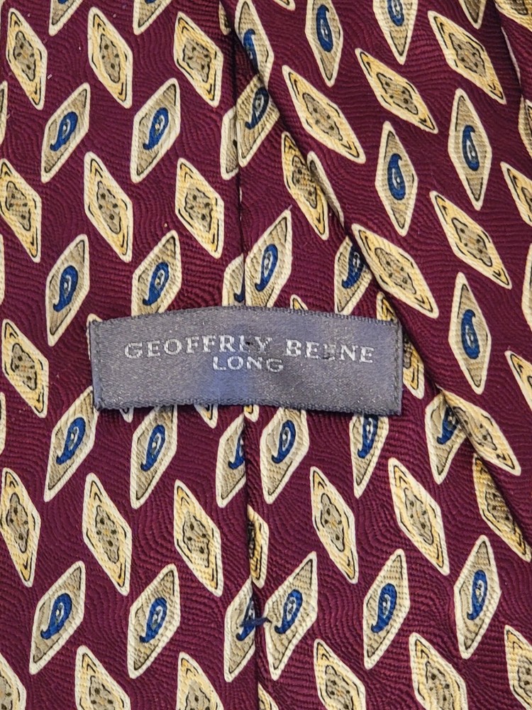 Mens Tie Geoffrey Beene 100% Silk Burgundy Geometric Multicolor Design Long Pro-owned, good condition, no fraying, pulls, or creases Imported Fabric 100% Silk, Made in the USA