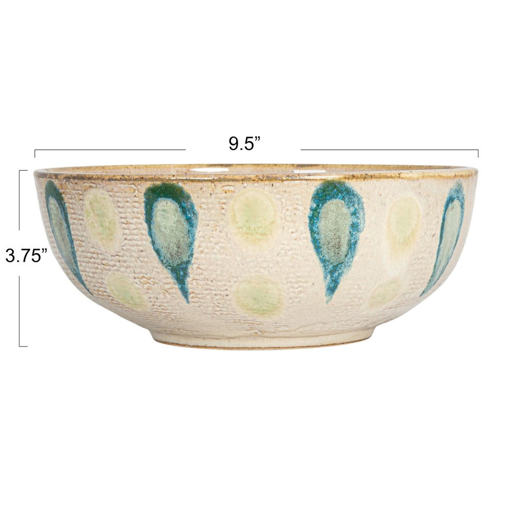 This Geometric Stoneware Bowl is a celebration of color and pattern, where the earth meets the sea in a dance of green and blue hues. The intricate geometric design, reminiscent of ancient mosaics, brings a touch of the exotic to the table, while the bronzed background adds a touch of warmth and depth. It's a piece that doesn't just hold food; it holds the gaze, inviting admiration and conversation. It measures 9.5 inches in diameter and 3.75 inches in height, providing a generous canvas for its intricate design. Whether filled with fresh fruits or left empty, it stands as a testament to the beauty that functional art can bring to everyday life. In a world that craves authenticity, this bowl is a genuine expression of global craftsmanship and style. A small, round stoneware bowl that captivates with a green and blue geometric pattern set against a bronzed background An artistic statement, it complements Boho, Scandinavian, Rustic, and Global decor styles with its vibrant, earthy palette This bowl is ideal for those who appreciate the art of presentation, serving as a striking vessel for varied creations Made of durable stoneware, this bowl is a harmonious blend of functionality and visual appeal, with a pattern that tells a story 9.5” Diameter x 3.75” H