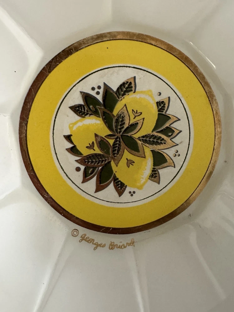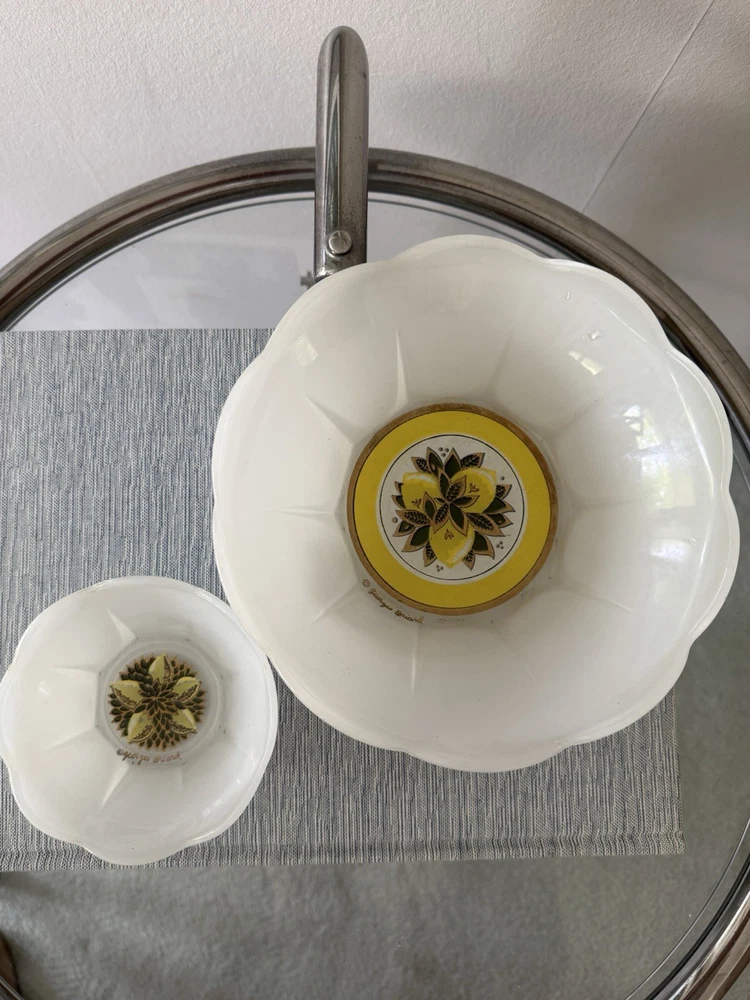 Georges Briard bowl chip and dip set. Mid Century Modern 2 piece Such a beautiful and rare find! Rare GEORGES BRIARD MCM glass LEMONS 2 piece CHIP & DIP scalloped Bowl set. No chips, but a few scratches in the white paint and a bit of wear in gold gilding. Pictures should reflect. The large bowl 8" Diameter 3" Height. The smaller bowl is 4" Diameter and 1.5" Height.