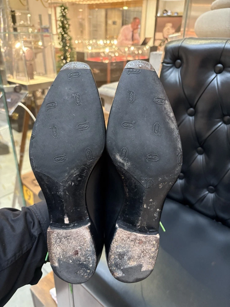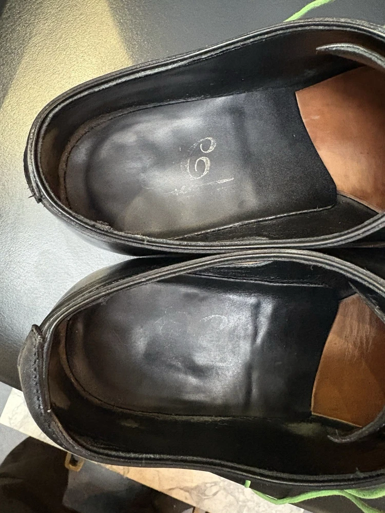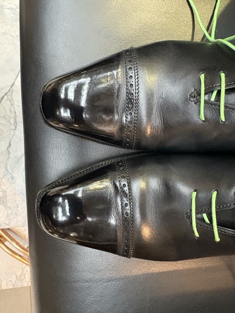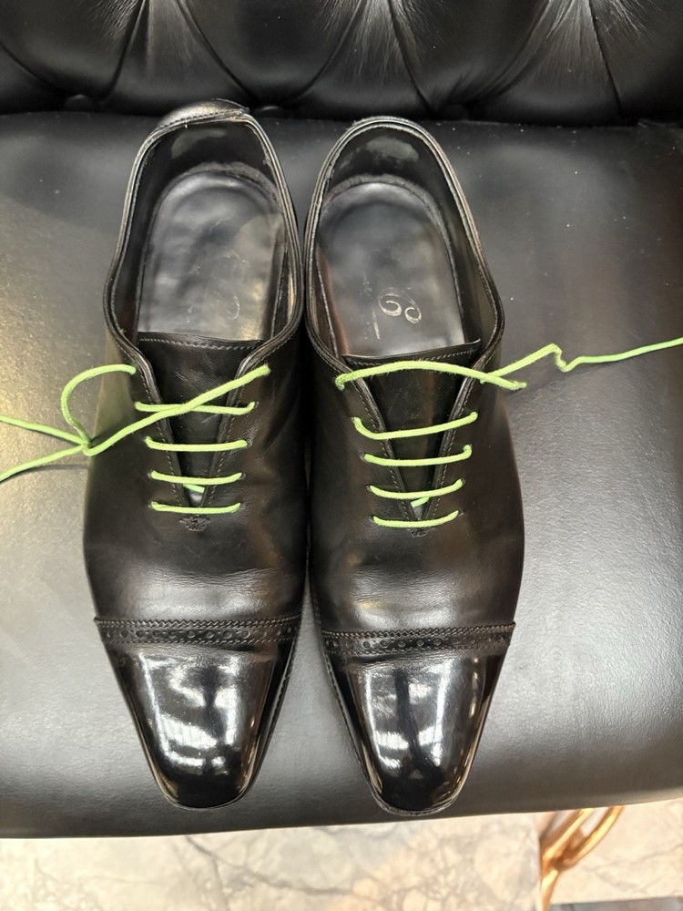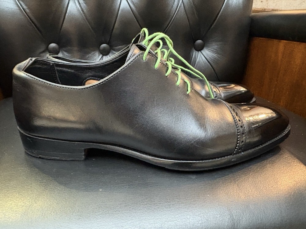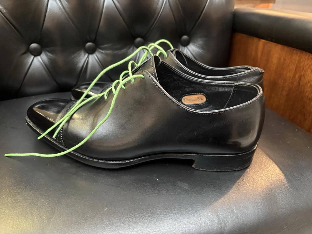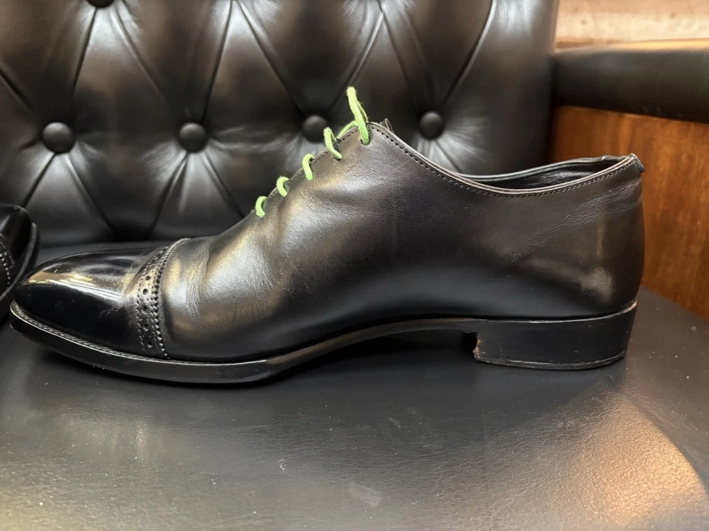 George Cleverley men's black captoe Oxford shoes with a high shined toe cap. Uk size 8, US size 9, EU size 42, E width fitting. Rubber sole and lulus added to protect the original leather sole. Wear and tear as shown in pictures. No original packaging.