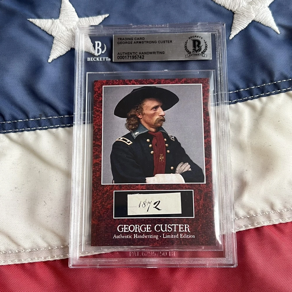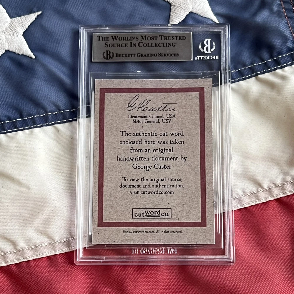 Offered here for the first time ever – genuine handwritten words from American military officer and legendary “Last Stand” Lieutenant Colonel George Armstrong Custer, authenticated and encapsulated by Beckett. An exclusive CutWordCo Limited Edition, this is the first set of Custer words encapsulated by Beckett ever offered for sale! Each individual word was carefully removed from an original handwritten letter from George Custer to his wife, Elizabeth. Don't miss this exceptional chance to own an authentic piece of penmanship from the legendary Little Bighorn hero. You will not receive a copy of the letter from Custer, the 3rd image is shown purely to illustrate where the words came from. You will only receive the BAS encapsulated handwriting, encapsulate #00017195742. The slab measures 3.25 inches by 5 inches. Each encapsulated word was individually removed from a September 1872 letter from Custer to his beloved wife, “My precious darling...”, Elizabeth “Libbie” Custer, affectionately signed, Autie. Custer’s nickname was “Autie” because, as a child he couldn’t pronounce his middle name, “Armstrong”, and the best his infant tongue could manage was, “Autie”. To conserve precious paper, Custer first wrote across the page horizontally, and later when pressed for space, he wrote vertically over the original note. This being said, some words feature additional handwriting from Custer overwritten vertically on the cut words. Genuine Custer documents can sell for thousands of dollars. The cost of authenticating a single word of Custer's handwriting is $250 on Beckett's website.