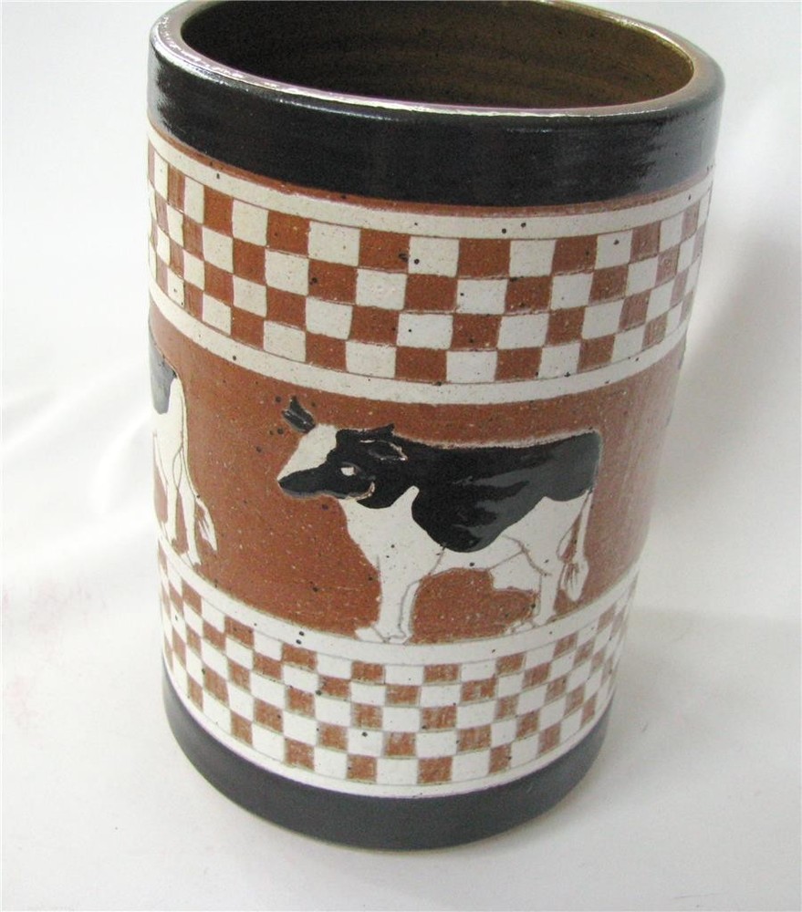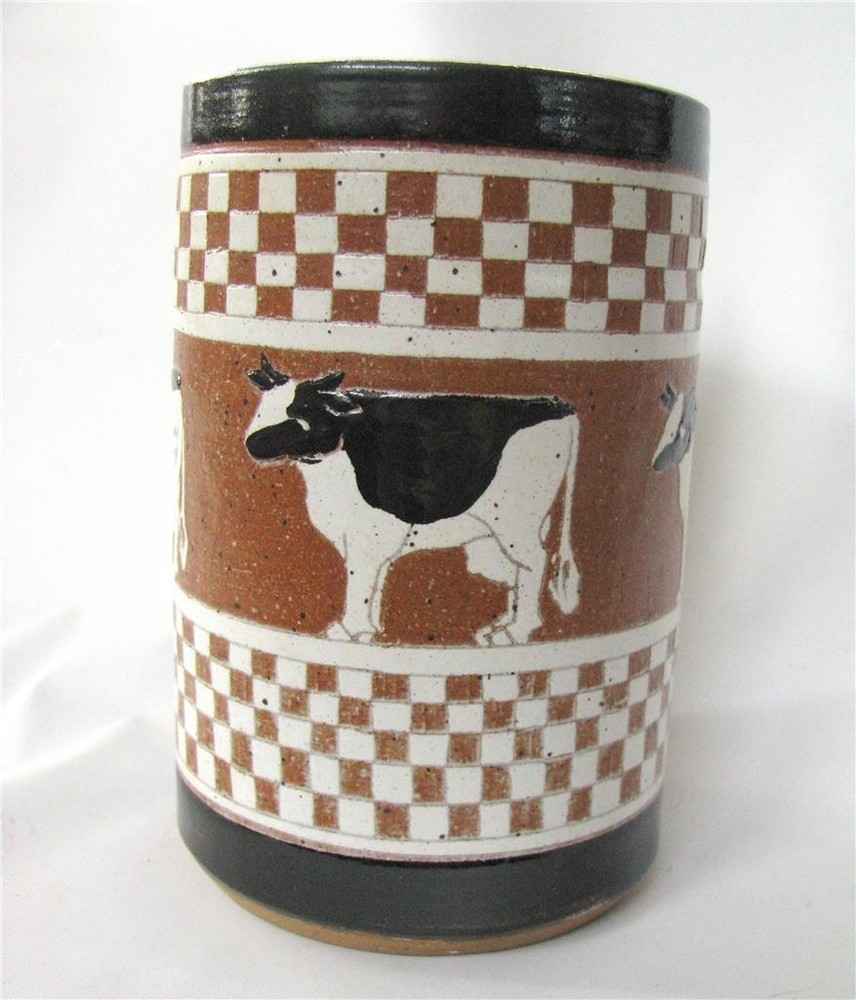 George Genszler Studio Stoneware Sgraffito Art Pottery Vase Utensil Cows Checker . ( from the internet)" pottery is wheel thrown, high-fired stoneware. An iron or porcelain slip is applied, images are carved into the clay using the sgrafitto (scratching away the negative area) method. Each piece is bisqued and then glazed fired at 2300 degrees, making them dishwasher and food safe." .Wheel thrown vase utensil holder signed dated 87? checkered border and a band of cows. Perfect. Measures 6 1/4" h x 4" d .check out our other auctions and store for more wonderful things! We will happily discount combined shipping:) Add me as a favorite seller and check back with my often as I am always on the hunt,and list new items weekly. George Genszler Studio Stoneware Art Pottery Vase Utensil Holder Cows Checker 6" George Genszler Studio Stoneware Art Pottery Vase Utensil Holder Cows Checker 6" Click images to enlarge Description George Genszler Studio Stoneware Sgraffito Art Pottery Vase Utensil Cows Checker . ( from the internet)" pottery is wheel thrown, high-fired stoneware. An iron or porcelain slip is applied, images are carved into the clay using the sgrafitto (scratching away the negative area) method. Each piece is bisqued and then glazed fired at 2300 degrees, making them dishwasher and food safe." . Wheel thrown vase utensil holder signed dated 87? checkered border and a band of cows. Perfect. Measures 6 1/4" h x 4" d .check out our other auctions and store for more wonderful things! We will happily discount combined shipping:) Add me as a favorite seller and check back with my often as I am always on the hunt,and list new items weekly. Payment Payment is expected within 3 days of purchase. Contact Us via Ebay secured mail Images sell! Get Supersized Images & Free Image Hosting Create your brand with Auctiva's Customizable Templates. Attention Sellers - Get Templates Image Hosting, Scheduling at Auctiva.com.