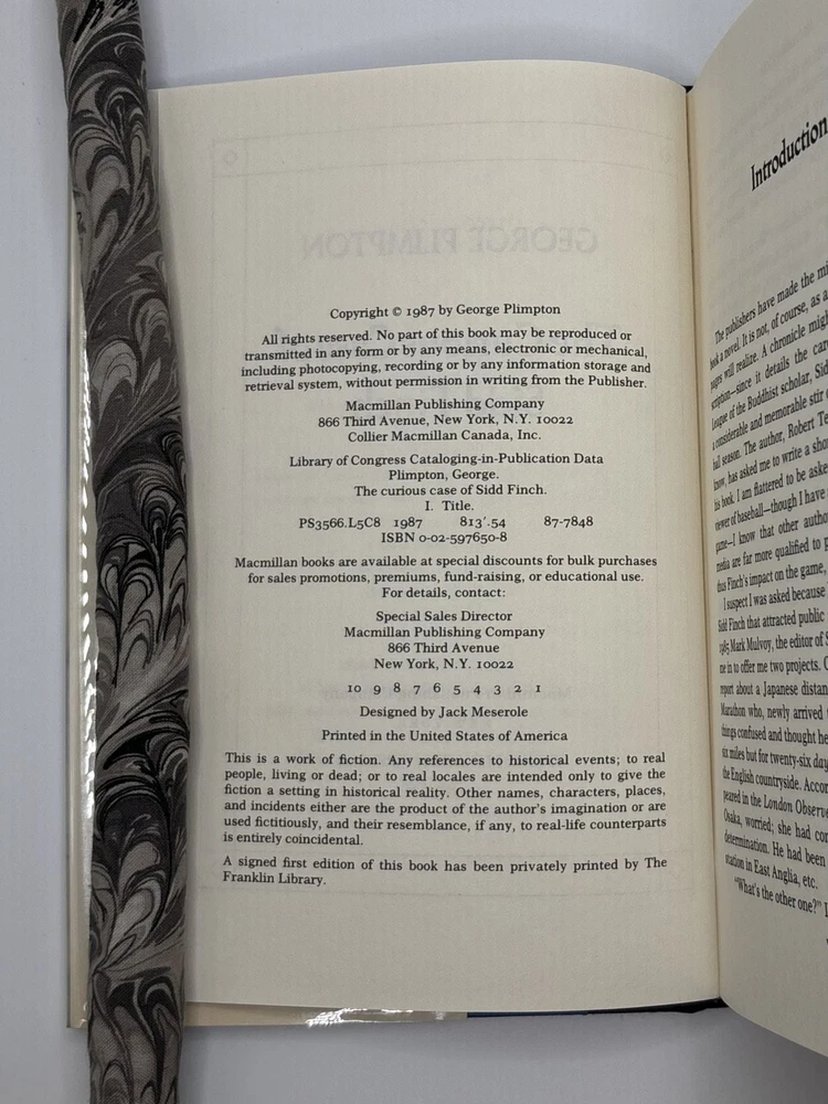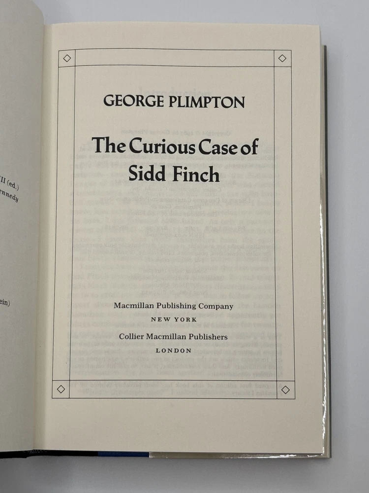 THE CURIOUS CASE OF SIDD FINCH [Signed] Author: Plimpton, George Title: THE CURIOUS CASE OF SIDD FINCH [Signed] Publication: New York, New York: Macmillan, 1987 Edition: First US Edition, First Printing Description: Octavo, 275 pages. In Very Good condition with Very Good condition dust jacket. Spine is light blue with dark green and orange lettering. Dust jacket protected by mylar covering, price cut from front flap, has mild shelving wear along spine head and a small chip to front fore corner. Boards have mild shelving wear along extremities. Signed flat by George Plimpton on front free endpaper. Shelved in hallway. Seller ID: 1392217 Subject: Literature, Politics, Government, and Law, Recreation & Leisure Welcome to the eBay store of Second Story Books! DC's Oldest Rare and Used Bookstore, Second Story Books operates two open shops in the Washington D.C. metropolitan area. We have an extensive internet presence and provide accredited appraisals member ASA. This listing was created by Bibliopolis.
