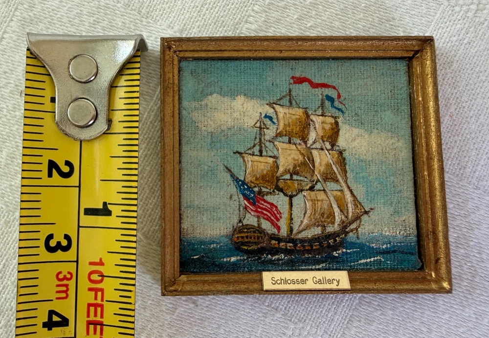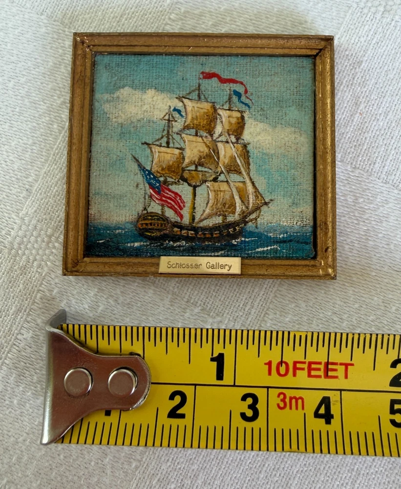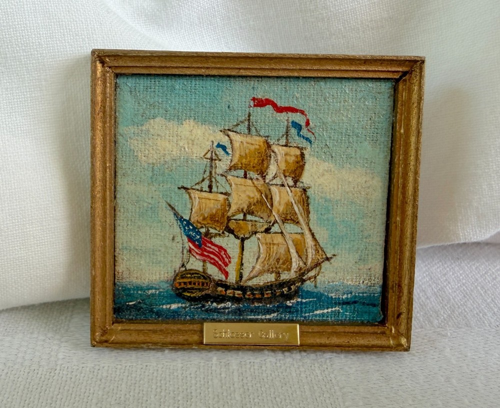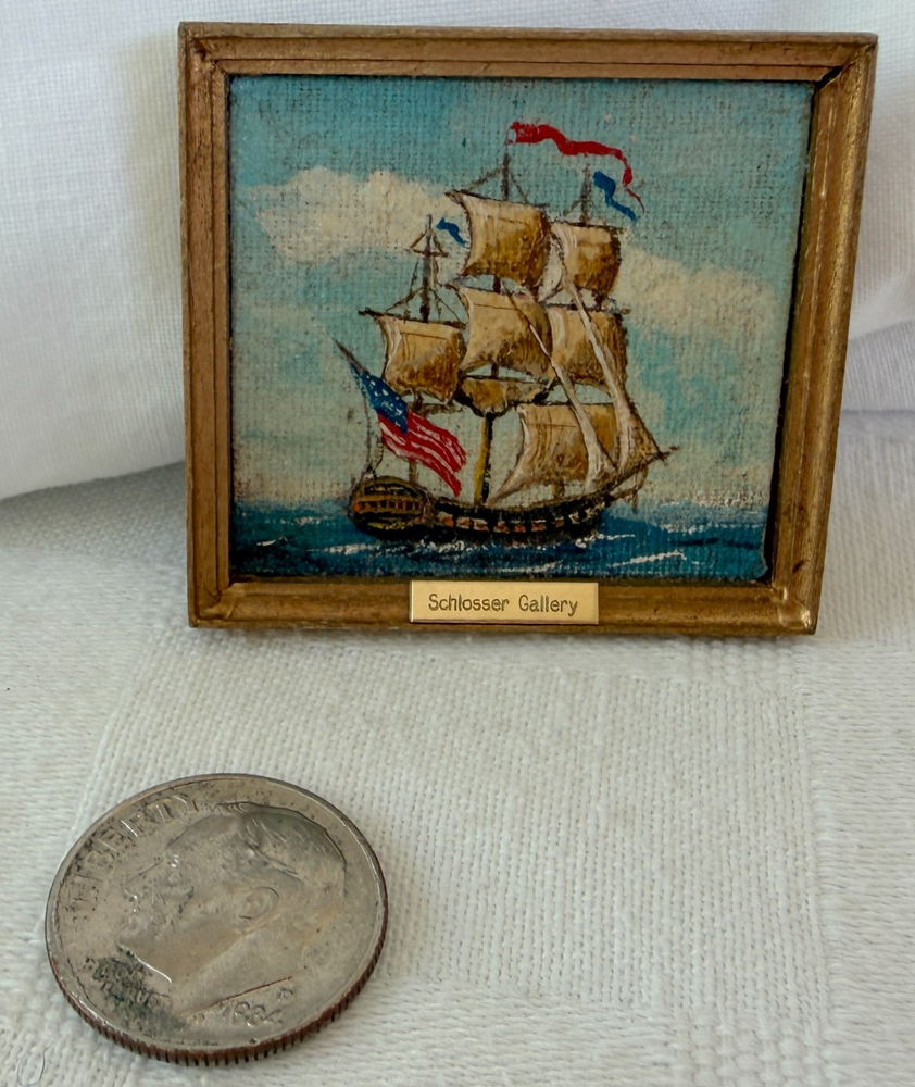 Beautiful tiny miniature oil painting depicting a square-rigged sailing ship at sea with an American flag. The back is signed and dated “George Schlosser ’83” and the front frame features a small brass name plate that reads “Schlosser Gallery.” George Schlosser is widely recognized as a notable miniature maker, and this piece fits the era and style associated with his work. Please review all photos carefully, as they are part of the description and show condition and details clearly. Measurements: Painting area: 1.75" W x 1.5" H (Note: overall framed size shown in photos with coin for reference.) (Please use the tape/coin photos for the most accurate size reference.) Condition: Signed on back: George Schlosser ’83 Brass plate on front: Schlosser Gallery Vintage condition with light surface wear consistent with age, including small scuffs/rubs to the frame Painting surface shows textured canvas weave ; no obvious major damage noted from photos Hanging loop attached on back 📬 Shipping: Carefully packed and shipped via USPS Ground Advantage. I’m happy to combine shipping on multiple items. 👉 Thanks for visiting! Check out my shop for other vintage finds. 👈