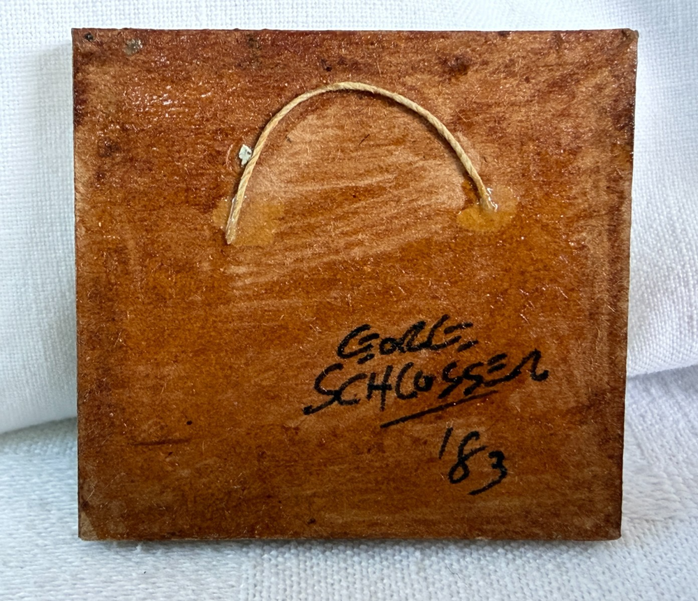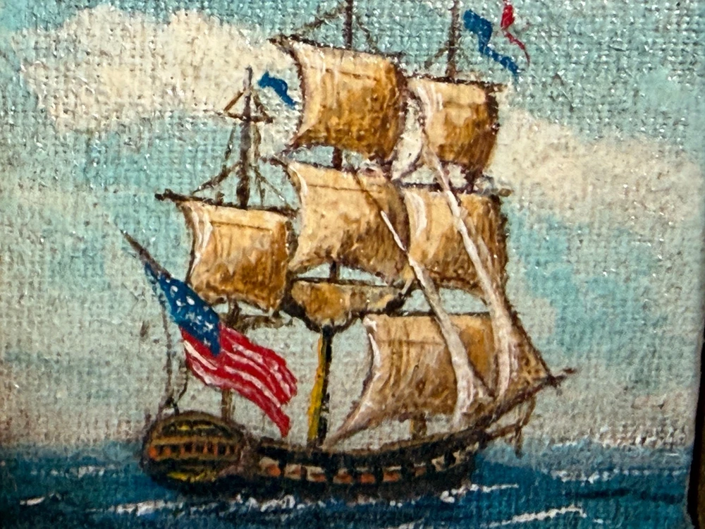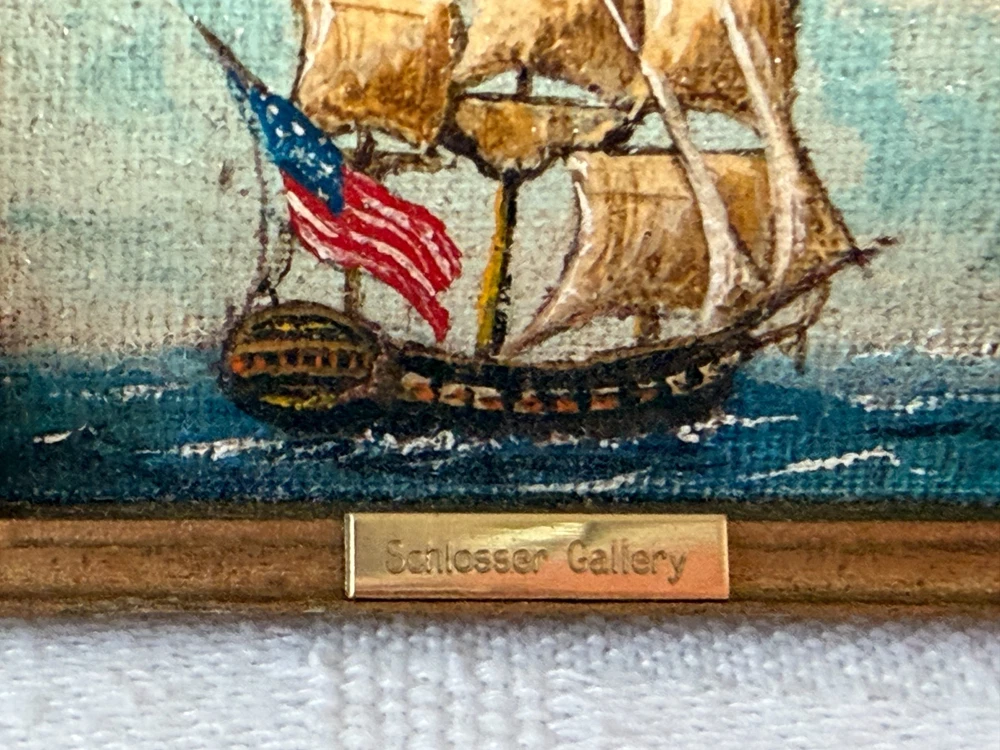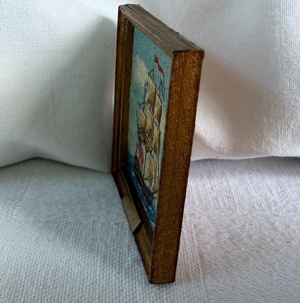 Beautiful tiny miniature oil painting depicting a square-rigged sailing ship at sea with an American flag. The back is signed and dated “George Schlosser ’83” and the front frame features a small brass name plate that reads “Schlosser Gallery.” George Schlosser is widely recognized as a notable miniature maker, and this piece fits the era and style associated with his work. Please review all photos carefully, as they are part of the description and show condition and details clearly. Measurements: Painting area: 1.75" W x 1.5" H (Note: overall framed size shown in photos with coin for reference.) (Please use the tape/coin photos for the most accurate size reference.) Condition: Signed on back: George Schlosser ’83 Brass plate on front: Schlosser Gallery Vintage condition with light surface wear consistent with age, including small scuffs/rubs to the frame Painting surface shows textured canvas weave ; no obvious major damage noted from photos Hanging loop attached on back 📬 Shipping: Carefully packed and shipped via USPS Ground Advantage. I’m happy to combine shipping on multiple items. 👉 Thanks for visiting! Check out my shop for other vintage finds. 👈