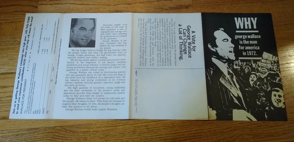 RARE 1972 George Wallace brochure---tear-off support coupon fully attached. Very Good Condition, no tears or rips----only slight yellowing on the edge from almost 50 years ago. Great photos inside, including homemade signs of support---be sure to enlarge the pictures! Want more than one? Discounts available! Ships USPS First Class Two sold, only two more available.