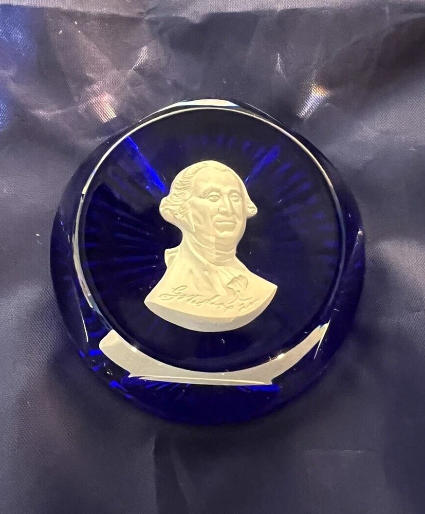 This exquisite paperweight features a stunning design by Crystal D'Albret/Danbury Mint . The multicolor crystal material is expertly crafted to create a unique and beautiful piece. Comes in original box. Part of Founding Fathers Collection. Made in France, this collectible item is a must-have for any decorative collection.