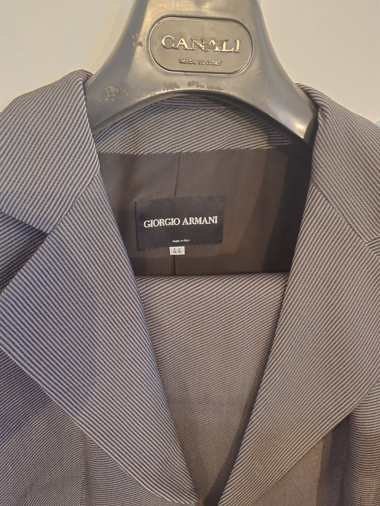 Set Includes:Jacket, TrousersSize:44Type:SuitStyle:Trouser SuitOccasion:BusinessSleeve Length:Long SleeveDepartment:WomenBrand:Georgio ArmaniNumber of Pieces:2 PieceCountry/Region of Manufacture:ItalyColour:Grey