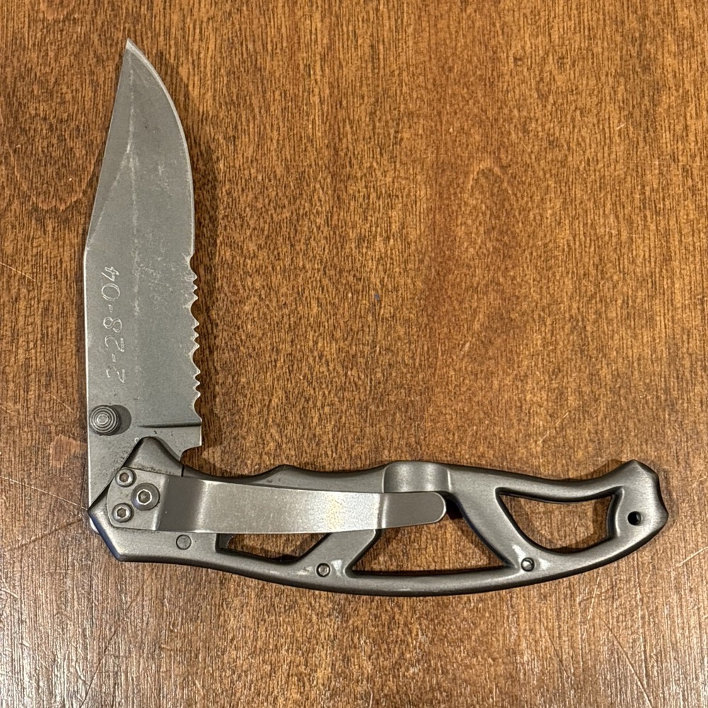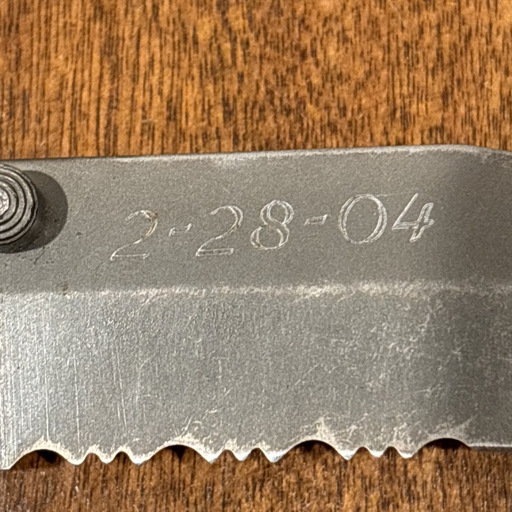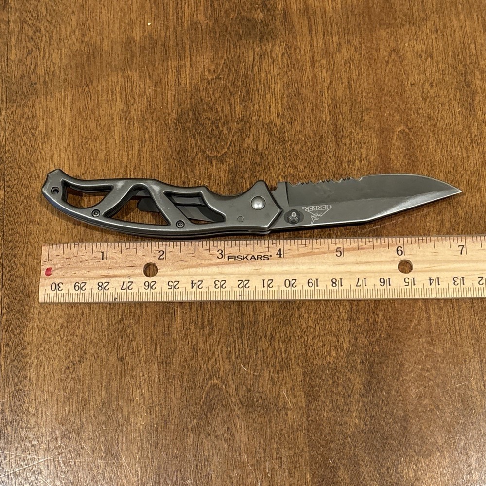 The Gerber Gear Paraframe 3" Folding Pocket Knife engraved with the date February 28, 2004 is a high-quality, modern folding knife designed for everyday carry. With a sleek silver color and a durable aluminum handle, this knife is both stylish and reliable. The serrated blade edge ensures easy and precise cutting, making it ideal for a variety of tasks. The single blade design and compact size make it convenient to carry in your pocket or on your keychain, providing you with a versatile tool whenever you need it.