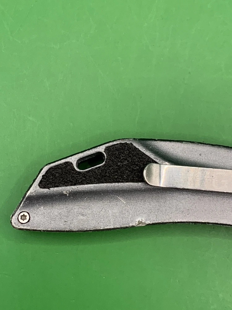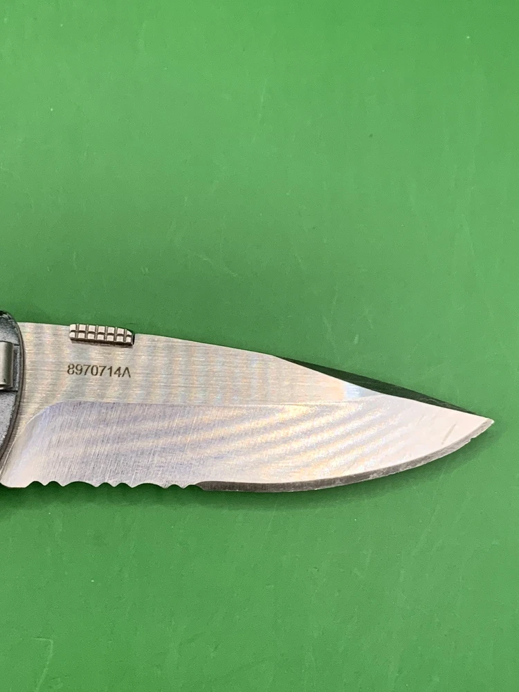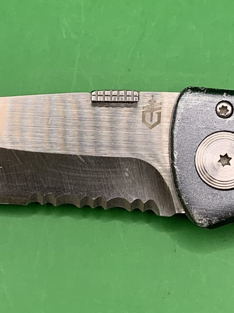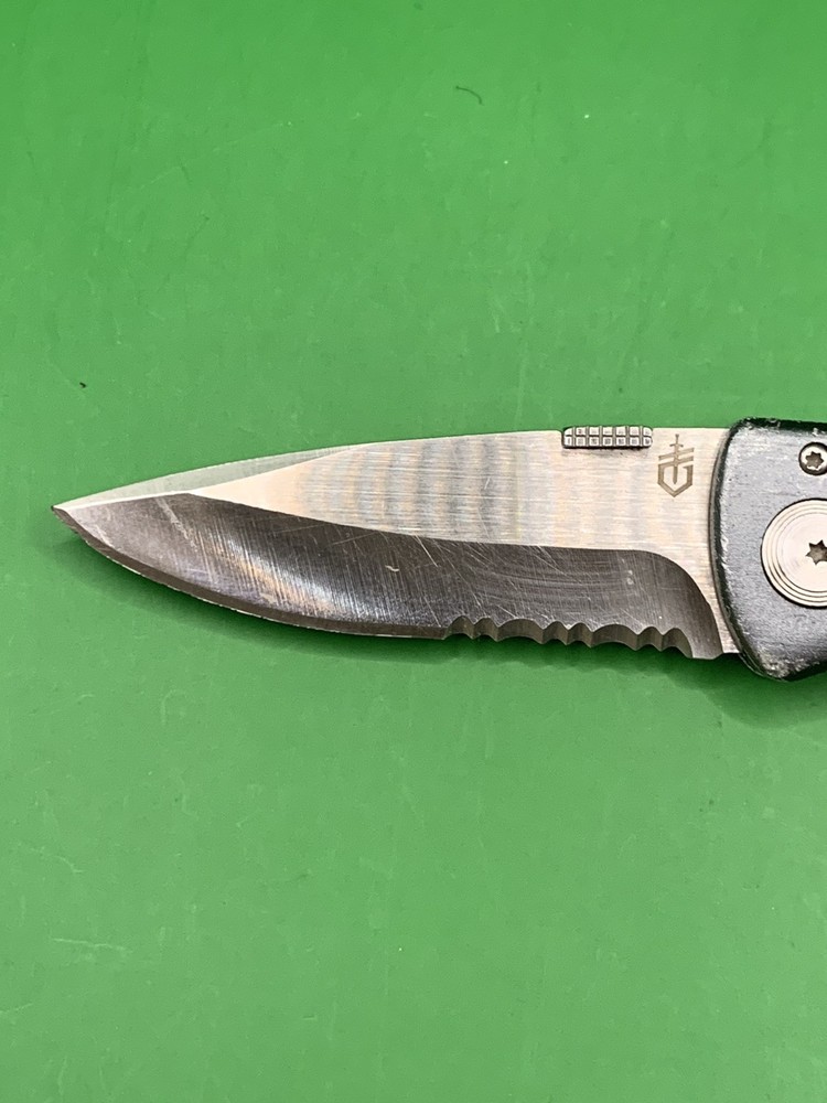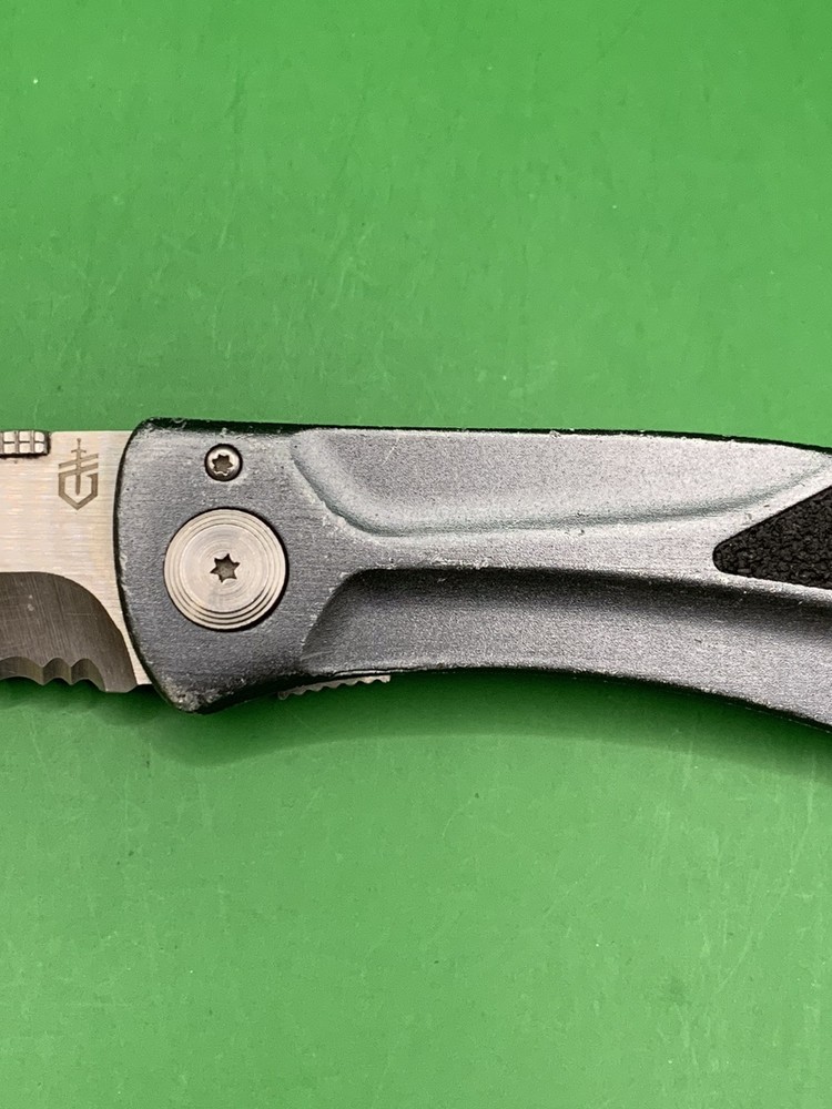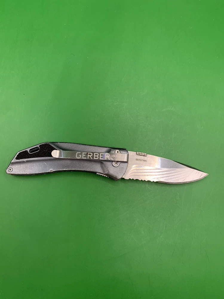 Used Gerber knife. Handle has some wear on the handle and the blade may need to be sharpened. There’s a very small knick near the tip of the blade. See pictures for overall cosmetic condition. By purchasing you affirm that you are of legal age and aware of all applicable laws.