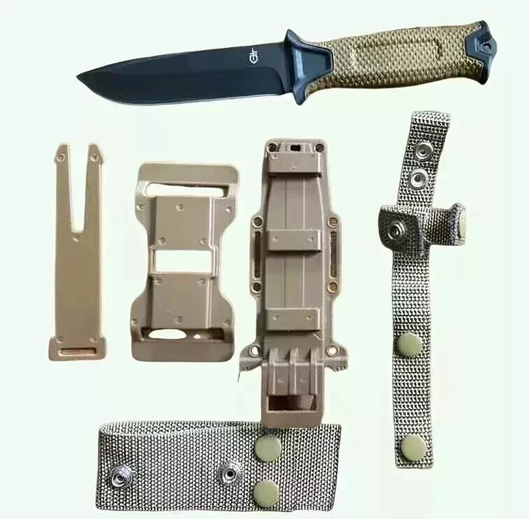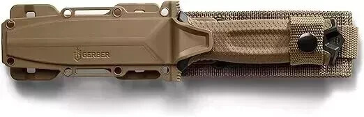 About this item description:: Tactical Knife: The Strongarm knife features a coyote brown handle and a serrated edge, full-tang steel blade Survival Knife: This durable knife has ceramic blade coating and rubberized diamond texture grip Survival Gear: This survival tool can break through hard surfaces in emergencies with the striking pommel Multiple Mounting Options: 4 mounting pieces and sheath can be used for mounting on MOLLE, belt or in drop-leg fashion Gerber Guarantee: As a testament to our unrelenting commitment to quality and service, Gerber is proud to offer a limited lifetime warranty on all products