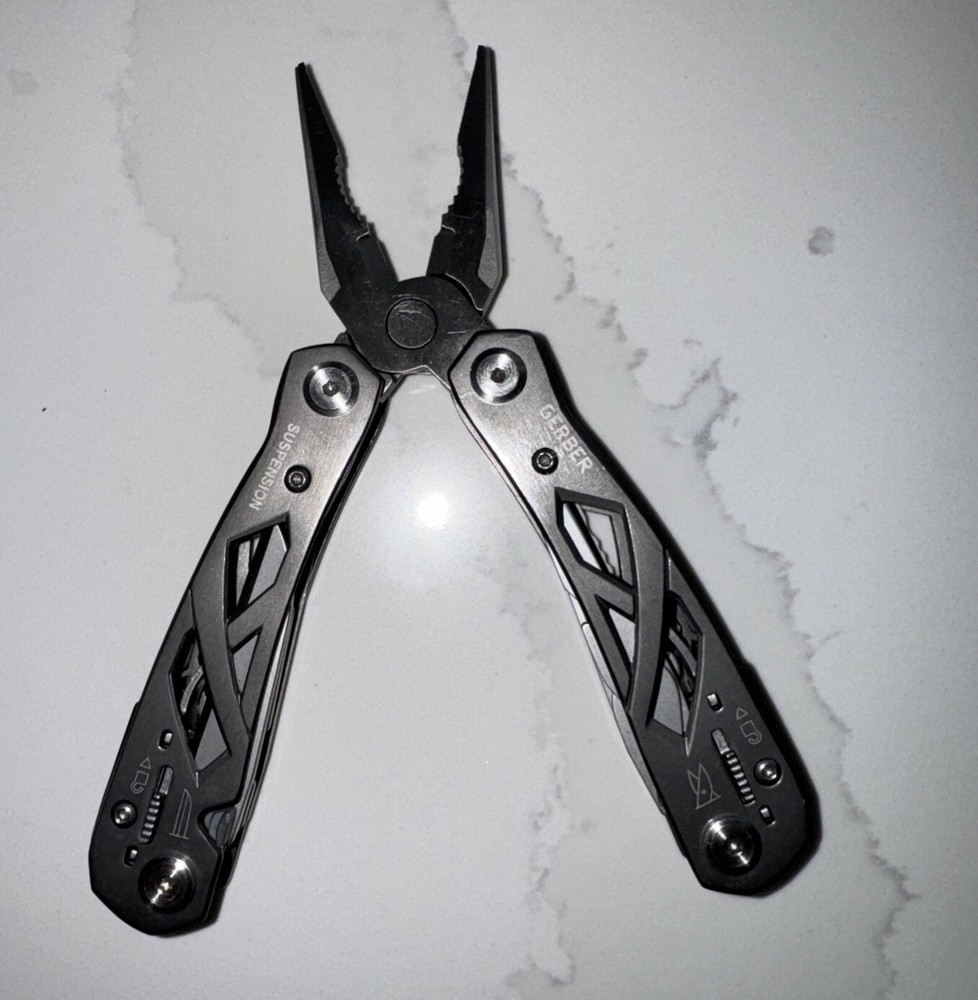 The Gerber Suspension Multi-Tool in Gray is a 10-in-1 tool made of stainless steel that comes with a sheath. It has a straight edge blade and a closed length of 4 inches. The tool includes pliers, a knife, a serrated knife, wire cutters, scissors, a medium screwdriver, a bottle opener, a Phillips screwdriver, and a can opener. It is made in the United States and is great for camping and hiking. It can be attached to a lanyard.