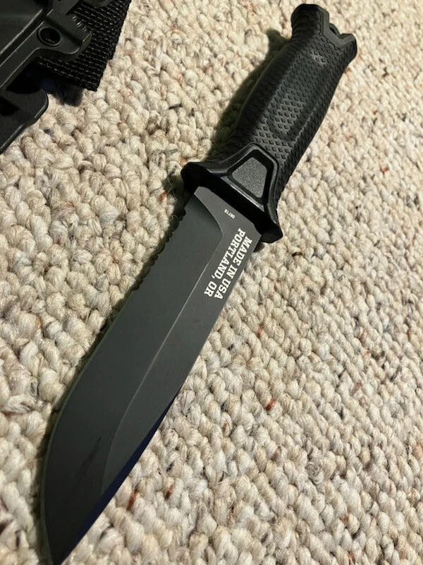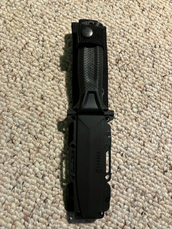 Gerber strongarm black serrated combat/utility knife. Lightly used, mostly just some finish wear from being taken out of the sheath. Edge in like new condition. Made in USA!